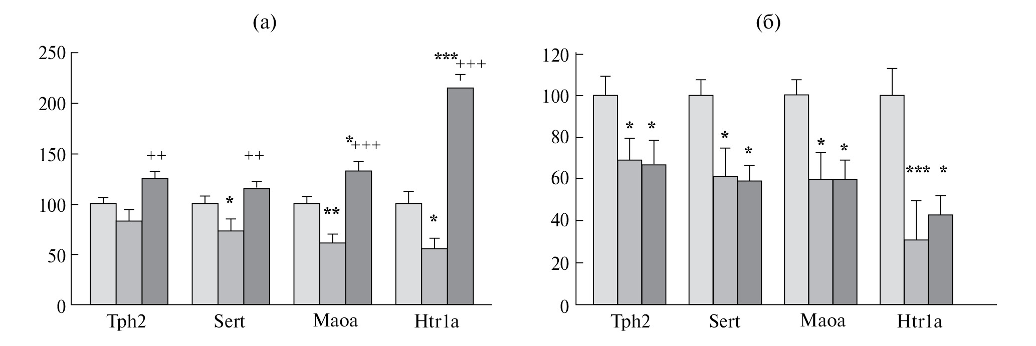 Рис. 3. Уровень экспрессии серотонергических генов Tph2, Sert (Slc6a4), Maoa, и Htr1a в ядрах шва среднего мозга у контроля (светлые столбики), агрессивных или депрессивных мышей после 20 дней агонистических взаимодействий (серые столбики) и после прекращения агонистических взаимодействий (темные столбики): а – изменения экспрессии генов у самцов с опытом агрессии [82]; б – изменения экспрессии генов у депрессивных самцов [46]. Данные представлены в процентах от среднего уровня у контрольных мышей. * – P < 0.05; **– P < 0.01; ***– P < 0.01 vs контроль; ++ – P < 0.01; +++ – P < 0.001.
