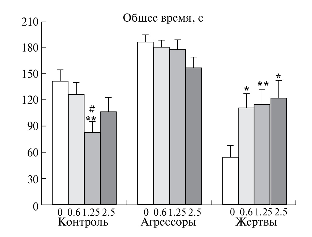 Различное действие на поведение агрессивных и субмиссивных животных оказали также препараты: флезиноксан, агонист серотониновых рецепторов первого типа 5-HT1a [27]; агонист дофаминовых рецепторов второго типа (D2) (+)3PPP [12]; и DAMGO, агонист мю-опиоидных рецепторов [68].