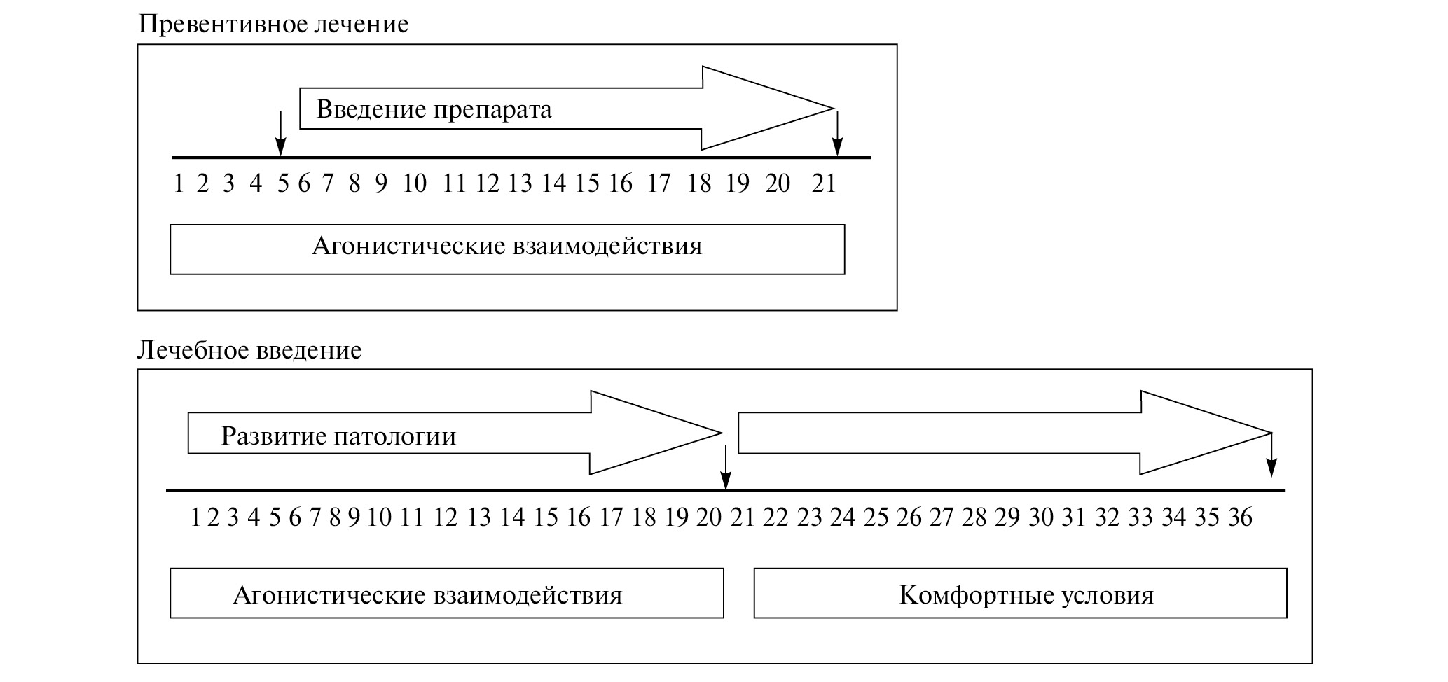 Превентивное введение. Этот способ позволяет выявить протекторные свойства препаратов. Для этого животным после 5 –7 дней социальных конфликтов, в течение которых формируются альтернативные типы социального поведения, на фоне продолжающихся агонистических взаимодействий ежедневно (как правило, в утренние часы) вводят препараты с предполагаемыми или известными терапевтическими свойствами (рис. 5). Агонистические взаимодействия проводят во второй половине дня. В аналогичном режиме такой же группе животных вводят растворитель (“плацебо”). После определенного периода фармакологического воздействия, который должен быть не менее 2-х недель для препаратов с предполагаемыми психотропными свойствами, исследуют всех животных в поведенческих тестах, сравнивая их поведение с контролем.