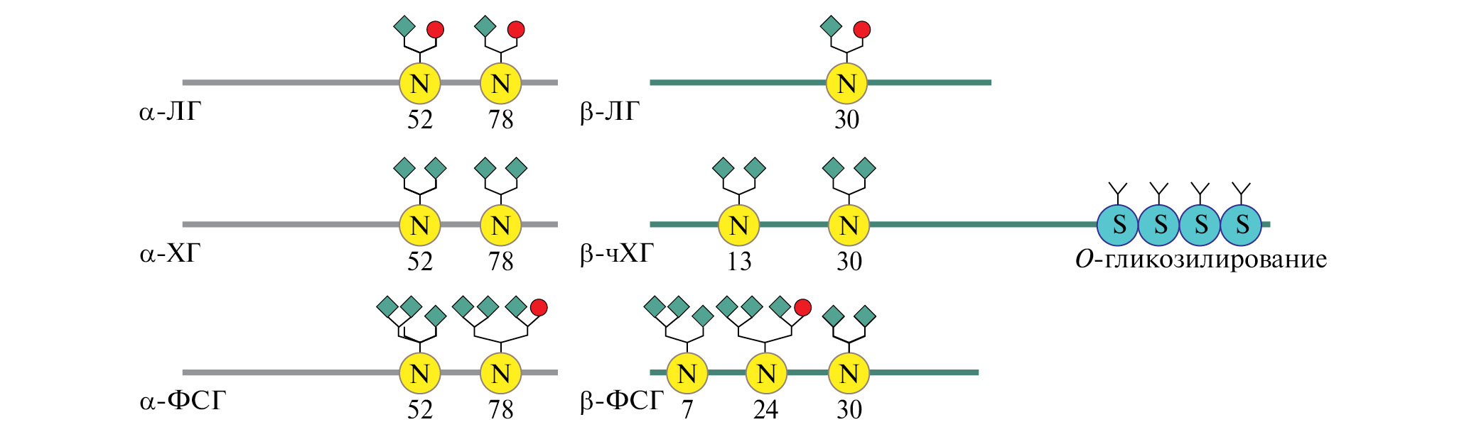 α- и β-Субъединицы подвергаются N-гликозилированию, поскольку содержат Asn-содержащие сайты, мишени N-гликозилтрансфераз, со структурой Lys-Asn-(Val/Ile) или (Glu/Tyr)-Asn-His [50]. В α-субъединице локализованы два таких сайта (Asn52, Asn78), в β-субъединице – один (β-ЛГ, Asn30) или два (β-чХГ, Asn13 и Asn30) сайта. В β-субъединице ФСГ, как и в β-чХГ, также имеются два сайта для N-гликозилирования (рис. 1). С-концевое расширение β-чХГ включает четыре сайта для O-гликозилирования, где мишенями O-гликозилтрансфераз являются остатки Ser121, Ser127, Ser132 и Ser138 [49, 50]. Степень гликозилирования, локализация и структура N-гликанов (разветвленность, заряд) в α- и β-субъединицах вносят значительный вклад в специфичность образования ими гетеродимерных комплексов и в их устойчивость, а также определяют связывающие характеристики и эффективность гонадотропинов, предвзятость их сигналинга, влияют на их фармакокинетику [15, 49, 50].