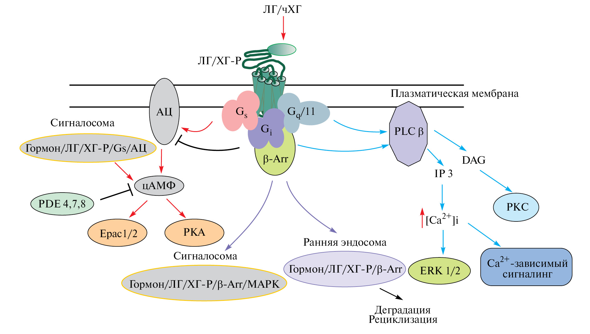 Рис. 2. Сигнальные пути, реализуемые через ЛГ/ХГ-Р, а также эндосомальный сигналинг, осуществляемый с участием гонадотропин-связанного ЛГ/ХГ-Р. Обозначения: ЛГ/ХГ-Р – рецептор ЛГ и чХГ; АЦ – аденилатциклаза; цАМФ – 3’-5’-циклический аденозинмонофосфат; PKA – протеинкиназа А; PDE4,7,8 – цАМФ-активируемые фосфодиэстеразы типов 4, 7 и 8; Epac1/2 – обменные белки типов 1 и 2, активируемые циклическим АМФ; Gs, Gi, Gq/11 – αβγ-гетеротримерные белки, стимулирующие (Gs) или ингибирующие (Gi) АЦ и активирующие кальциевый сигналинг (Gq/11); β-Арр – β-аррестин; ERK1/2 – киназы типов 1 и 2, регулируемые внеклеточными сигналами; PLCβ – фосфоинозитид-специфическая фосфолипаза Cβ; DAG – диацилглицерин; IP3 – инозитол-3,4,5-трифосфат; [Ca2+]i – внутриклеточная концентрация Ca2+; PKC – форболчувствительные изоформы протеинкиназы С.