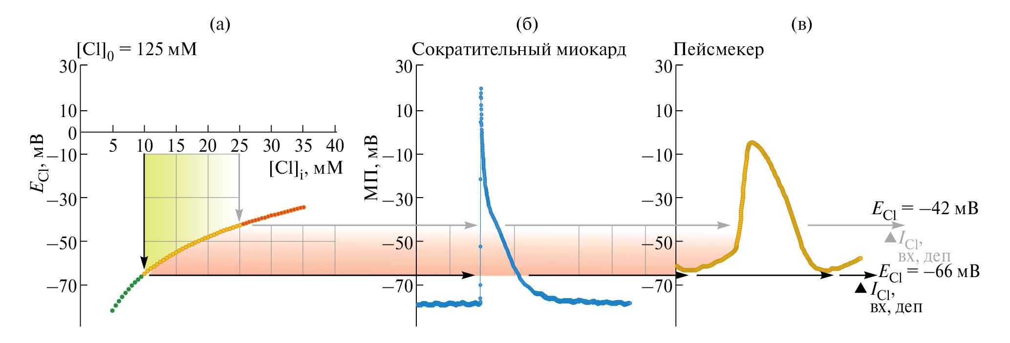 Уровень [Cl–]i определяется не только соотношением экспрессии KCC/NKCC, но и, при прочих равных условиях, соотношением продолжительности пребывания кардиомиоцитов в покоящемся и деполяризованном состоянии, а также уровнем ПП. Интенсивность переноса хлора KCC и NKCC в рабочих и пейсмекерных кардиомиоцитах будет разная. Работа KCC и NKCC в этих двух типах клеток даже при одинаковом уровне экспрессии будет приводить к установлению различных значений [Cl–]i, и ECl (см. рис. 5, а–б).