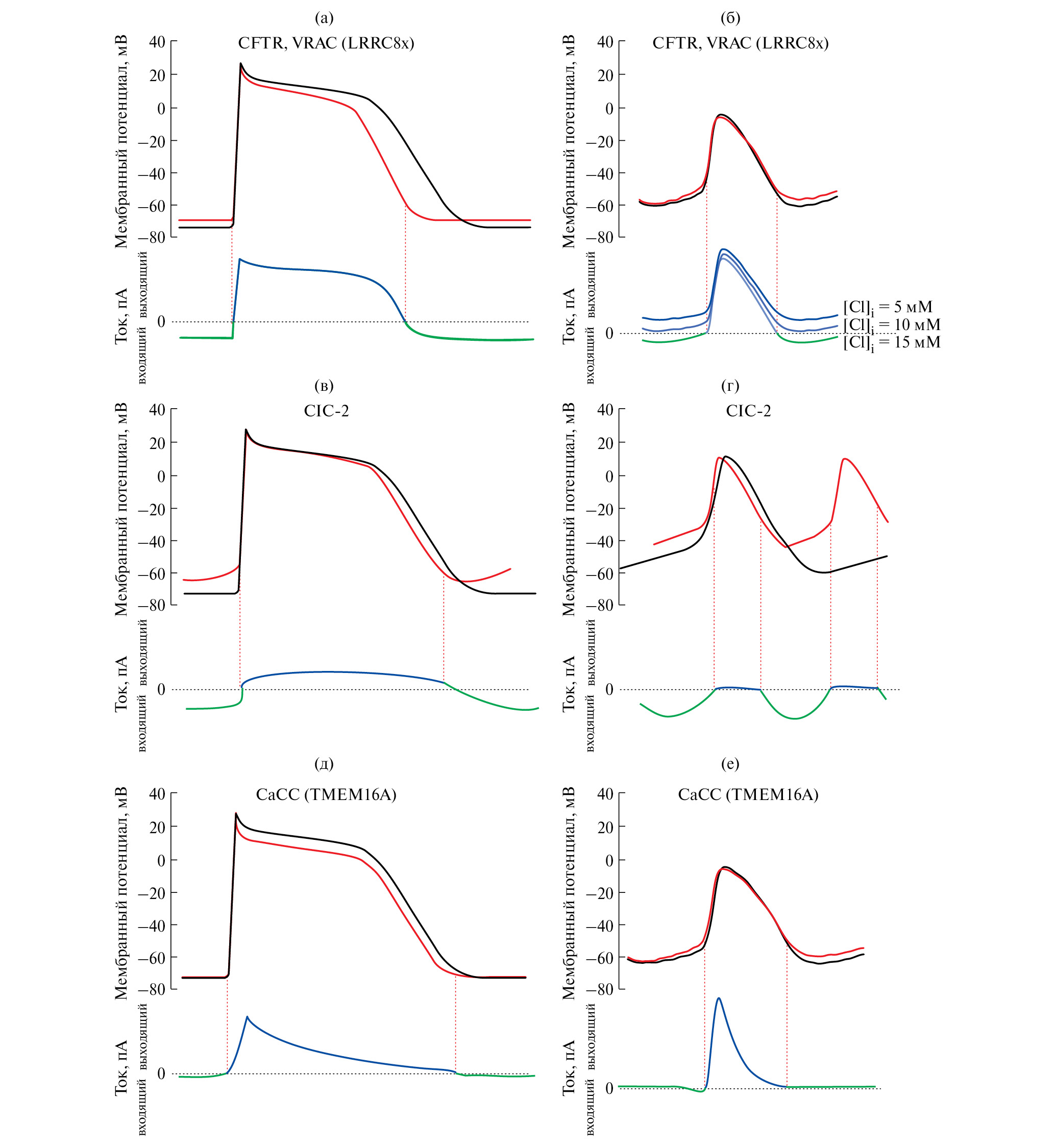 Рис. 2. Верхние панели – изменение конфигурации потенциала действия кардиомиоцитов рабочего (слева) и пейсмекерного (справа) миокарда при активации хлорных каналов. Черный цвет – потенциал действия в контроле, красный цвет – потенциал действия при активации разных типов хлорных каналов – CFTR (а–б), LRRC8x (а–б), ClC-2 (в–г), TMEM16A (д–е). Нижние панели – изменение хлорного тока через разные хлорные каналы в зависимости от мембранного потенциала в ходе потенциала действия кардиомиоцитов рабочего (слева) и пейсмекерного (справа) миокарда – CFTR (а–б), LRRC8x (а–б), ClC-2 (в–г), TMEM16A (д–е). Зеленый цвет – входящий ток (ионы хлора выходят из клетки), синий цвет – выходящий ток (ионы хлора входят в клетку). На панели б входящая и выходящая компонента тока показаны для трех значений [Cl–]i, поскольку эта величина может различаться для центральной и периферической частей гетерогенной ткани САУ, что обуславливает различные электрофизиологические эффекты. Кривые построены с использованием уравнения Гольдмана–Ходжкина–Каца (ГХК) для трансмембранного ионного тока и учета вероятности пребывания канала в открытом состоянии.
