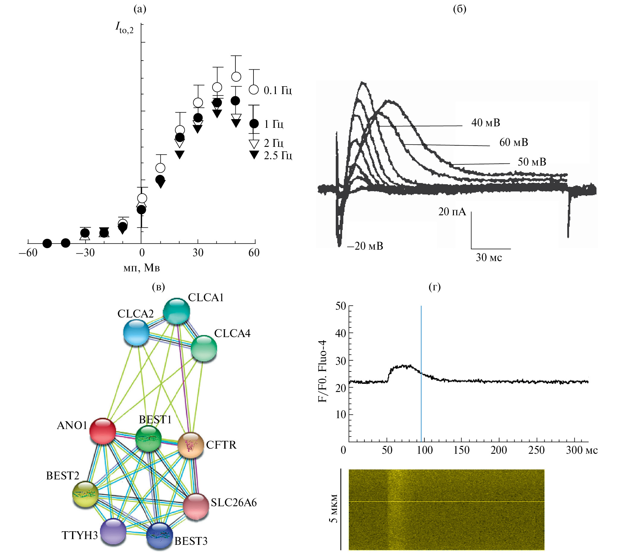 Рис. 3. Свойства кальций-зависимого хлорного тока Ito,2 канала TMEM16A (Ano1): а – вольт-амперная характеристика Ito,2 при разных частотах стимуляции (0,1–2,5 Гц). Приведено с изменениями по Wang Zh. et al., Am. J. Physiol., 268, H1992-H2002, 1995; б – оригинальные записи Ito,2 при ступенчатом протоколе изменения поддерживаемого потенциала от –20 до +60 мВ. приведено с изменениями по Li G-R et al., Am. J. Physiol., 269, H463-H472, 1995; в – взаимодействие кальций-зависимого хлорного канала TMEM16A (ANO1), являющегося молекулярным субстратом Ito,2, c различными белками. ANO1 – кальций-зависимый хлорный канал TMEM16A, CLCA1, CLCA2, CLCA4 – регуляторные субъединицы хлорных каналов, BEST1, BEST2, BEST3 – бестрофины 1–3, CFTR – трансмембранный регулятор муковисцидоза, SLC26A6 – хлор-бикарбонатный обменник, TTYH3 – белок семейства tweety; г – репрезентативные примеры спонтанных “кальциевых волн”, регистрируемых в изолированных кардиомиоцитах. Сверху – кривые флюоресценции Fluo-4, полученные в результате усреднения значений по линии сканирования 5 мкм, снизу – псевдоизображения, отражающие изменение уровня флюоресценции во времени (за 300 мс) по линии сканирования (горизонтальная ось – время, вертикальная ось – линия сканирования).