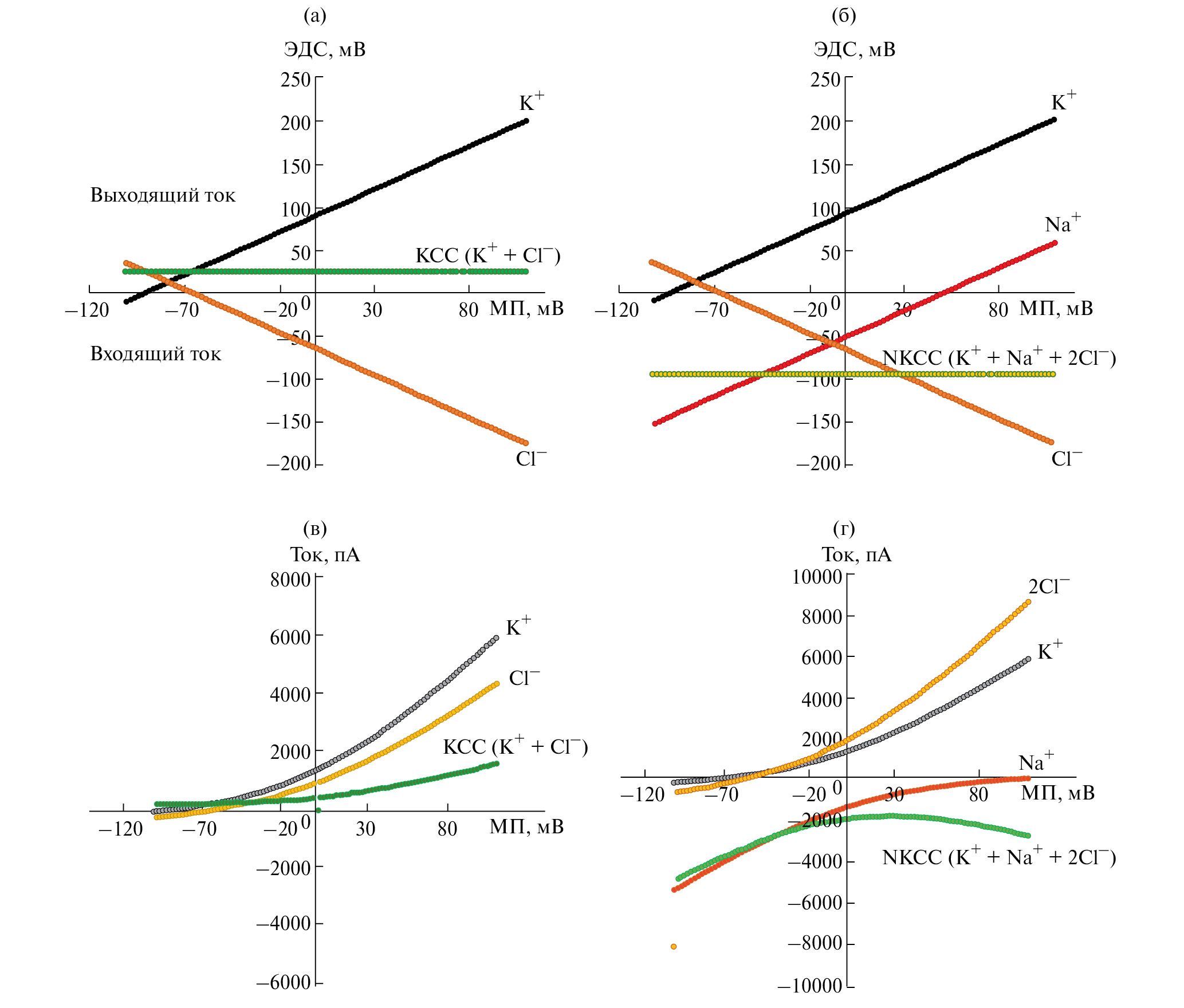 Рис. 4. Электрические характеристики хлор-катионных котранспортеров: а – зависимость электродвижущей силы (ЭДС) от мембранного потенциала (МП) для ионов калия, хлора и котранспортера KCC; б – зависимость электродвижущей силы (ЭДС) от мембранного потенциала (МП) для ионов натрия, калия, хлора и котранспортера NKCC; в – вольт-амперная характеристика калиевого и хлорного токов, а также суммарного тока котранспортера KCC; г – вольт-амперная характеристика натриевого, калиевого и хлорного токов, а также суммарного тока котранспортера NKCC.