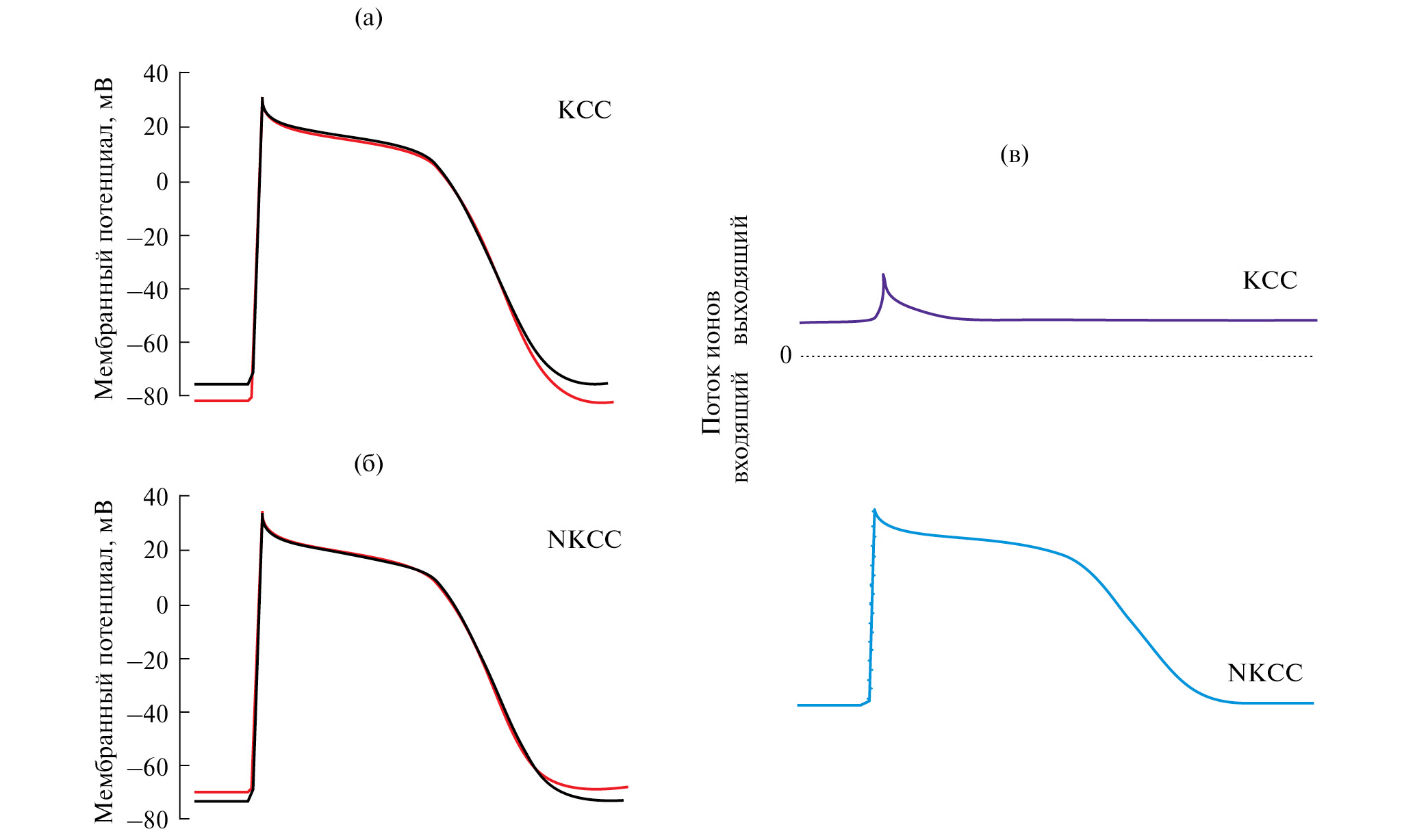 Рис. 5. Эффекты активации хлор-катионных котранспортеров на электрическую активность рабочего миокарда: а – изменение конфигурации потенциала действия кардиомиоцита рабочего миокарда при активации котранспортера ионов хлора и калия KCC (красный цвет, с учетом активности KCC) по сравнению с контролем (черный цвет, без учета активности KCC); б – изменение конфигурации потенциала действия кардиомиоцита рабочего миокарда при активации котранспортера ионов хлора и калия NKCC (красный цвет, с учетом активности NKCC) по сравнению с контролем (черный цвет, без учета активности NKCC); в – изменение интенсивности потока ионов хлора через котранспортеры KCC и NKCC в зависимости от мембранного потенциала.