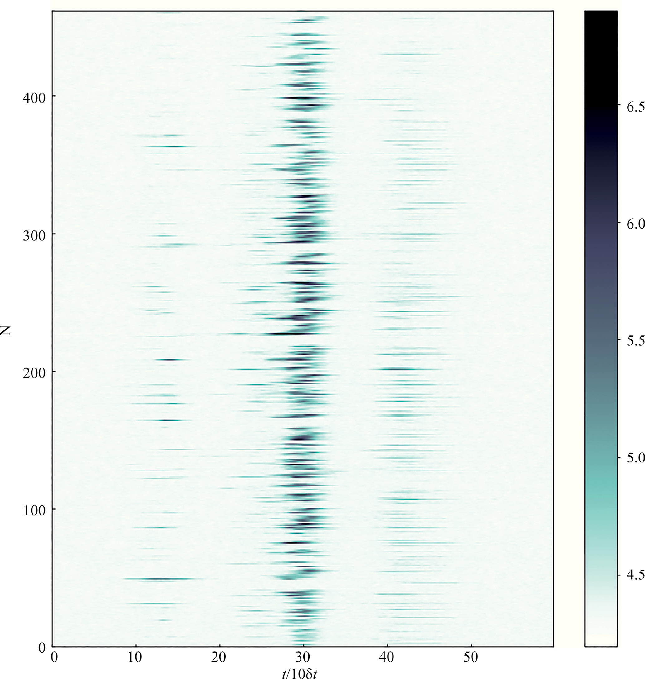 Рис. 1. Развертка с шагом 10δτ ≈ 2.0496 мс, отвечающим повороту пульсара на ≈ 1°, профиля интенсивности излучения PSR B0329+54 (усл. ед.), принимаемого в диапазоне 109.6–112 МГц, для серии последовательных кадров N = 1, ..., 450 импульса пульсара после компенсации дисперсионного запаздывания с использованием найденной меры дисперсии = 26.76 пк/см³.