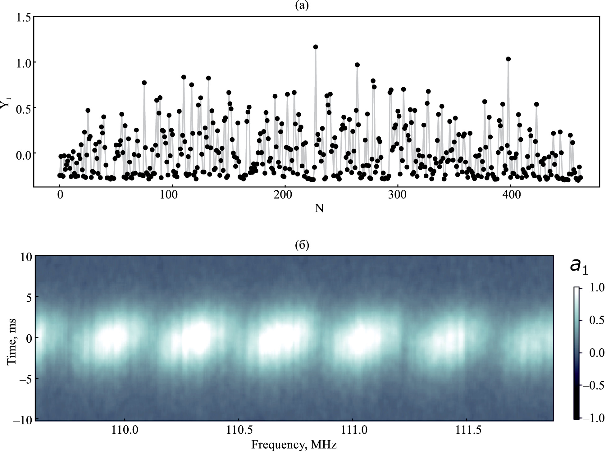 Рис. 2. Первая, наиболее весомая ЧВЭОФ в разложении динамического спектра PSR B0329+54 методом периодических главных компонент: (a) — относительный вклад Y₁ (τN) на последовательности кадров (оборотов пульсара) N = 1, ..., 450; (b) — частотно-временная форма с признаками модуляции фарадеевского типа.