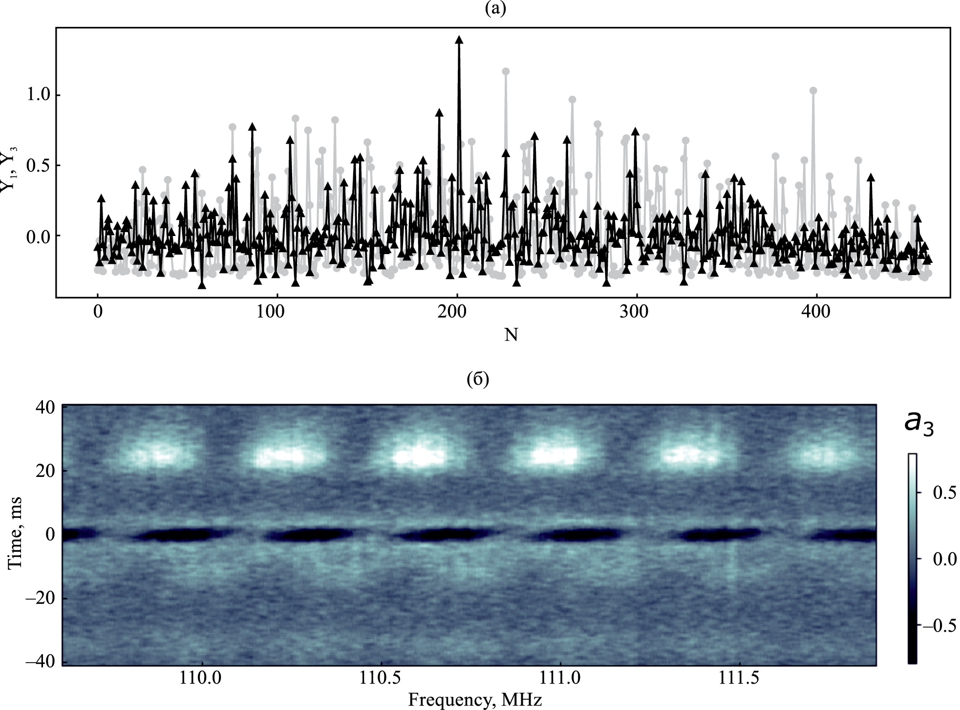 Рис. 3. Третья ЧВЭОФ в разложении динамического спектра PSR B0329+54: (a) — относительный вклад Y₃ (τN) (треугольники, черная ломаная) в сравнении с вкладом Y₁ (τN) первой ЧВЭОФ (кружки, серая ломаная) на последовательности кадров N = 1, ..., 450; (b) — частотно-временная форма с признаками модуляции фарадеевского типа, включающая в основном “верхнюю” составляющую импульса V при временах около 26 мс и отчасти “нижние” составляющие I и VI при временах около –33 мс и –10 мс, а также следы “центральной” составляющей III при t ≈ 0.