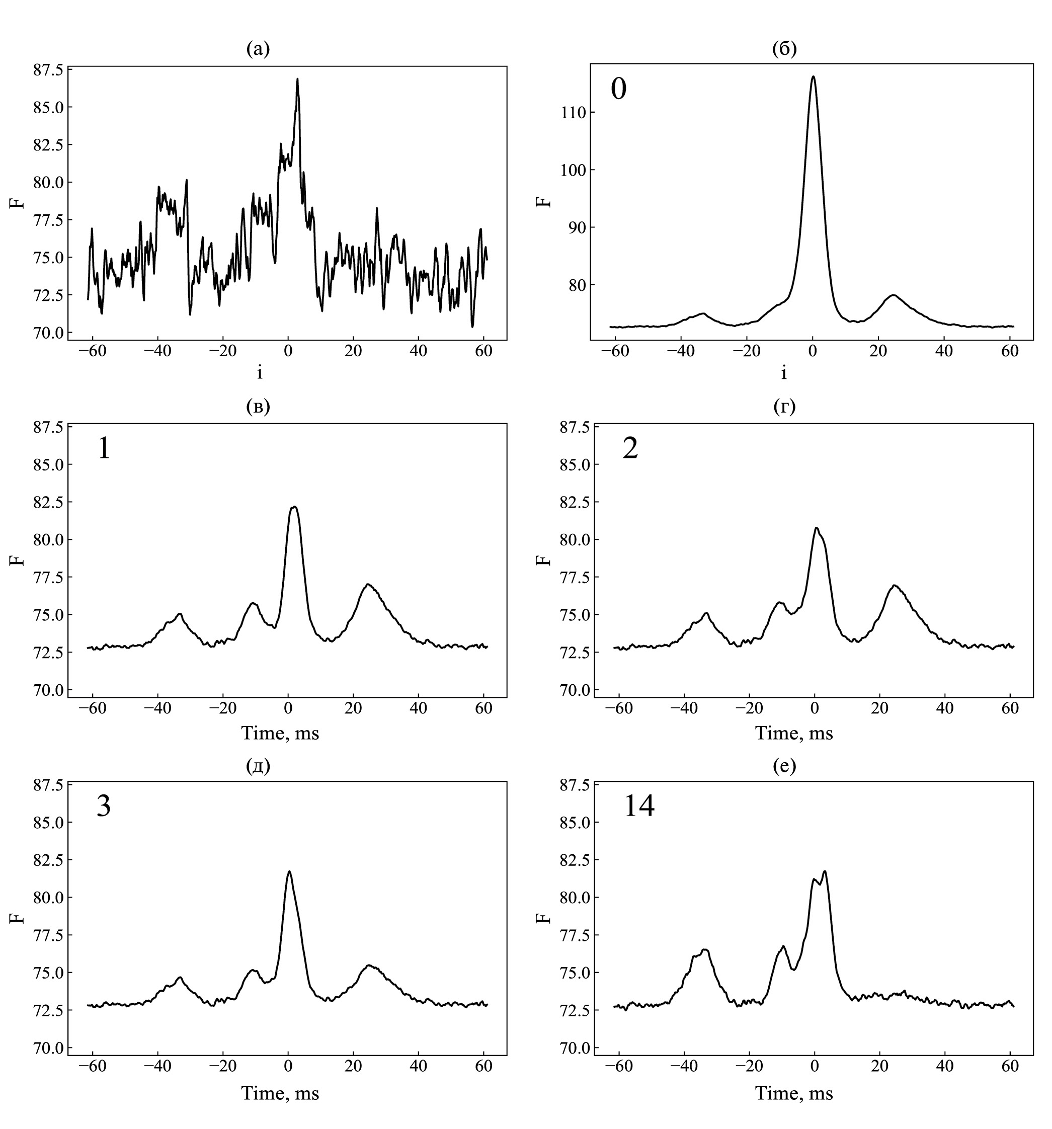 Рис. 4. Аппроксимация интенсивности импульса PSR B0329+54 (усл. ед.), просуммированной по 500 каналам в полосе шириной почти 2.5 МГц на несущей частоте 111 МГц, для N-го временного окна (кадра) длительностью 50 мс с шагом δτ ≈ 2.0496 мс, отвечающим повороту пульсара на ≈ 1°: (a) — исходные данные ⟨∑ⱼS(vⱼ,tₖ)⟩ (после первичной обработки согласно разделу 3, но без перехода к логарифму s = ln(S + C) ); (с) — усредненный по частоте и всем сериям наблюдений профиль импульса ⟨∑ⱼS(vⱼ,tₖ)⟩; (б)–(е) — модификация этого профиля путем дополнительного включения ряда первых ЧВЭОФ с наибольшими весами — одной, двух, трех и четырнадцати соответственно.
