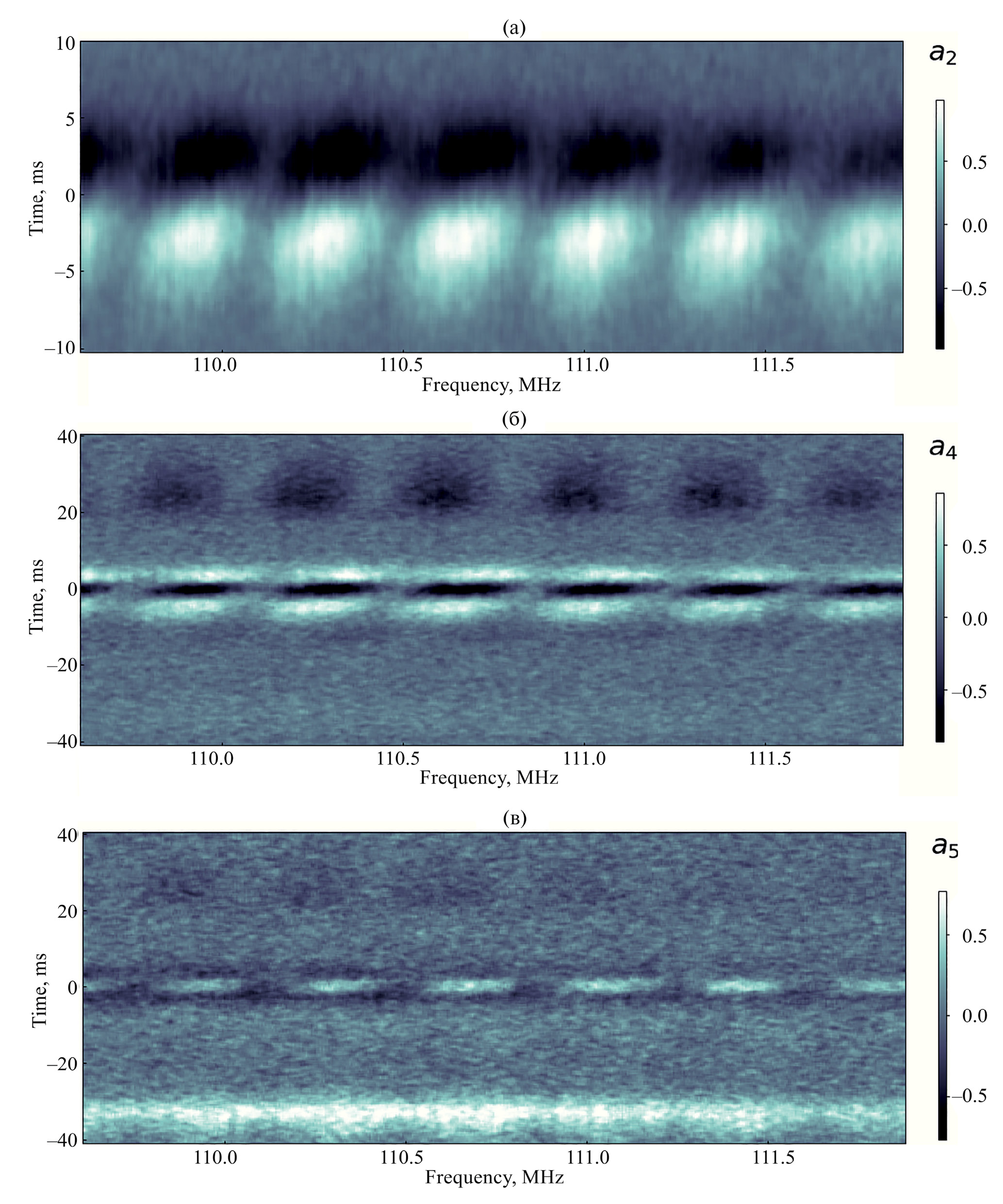 Рис. 5. Вторая (a) a₂, четвертая (б) a₄ и пятая (в) a₅ ЧВЭОФ в разложении динамического спектра PSR B0329+54, демонстрирующие асимметрию и слабую корреляционную связь основных составляющих импульса: “центральной” III-й при t ≈ 0 (с ее тонкой структурой) и “удаленных” V-й и I-й (отвечающих временам t около 26 мс и –33 мс соответственно), различающихся глубиной “фарадеевской” модуляции.