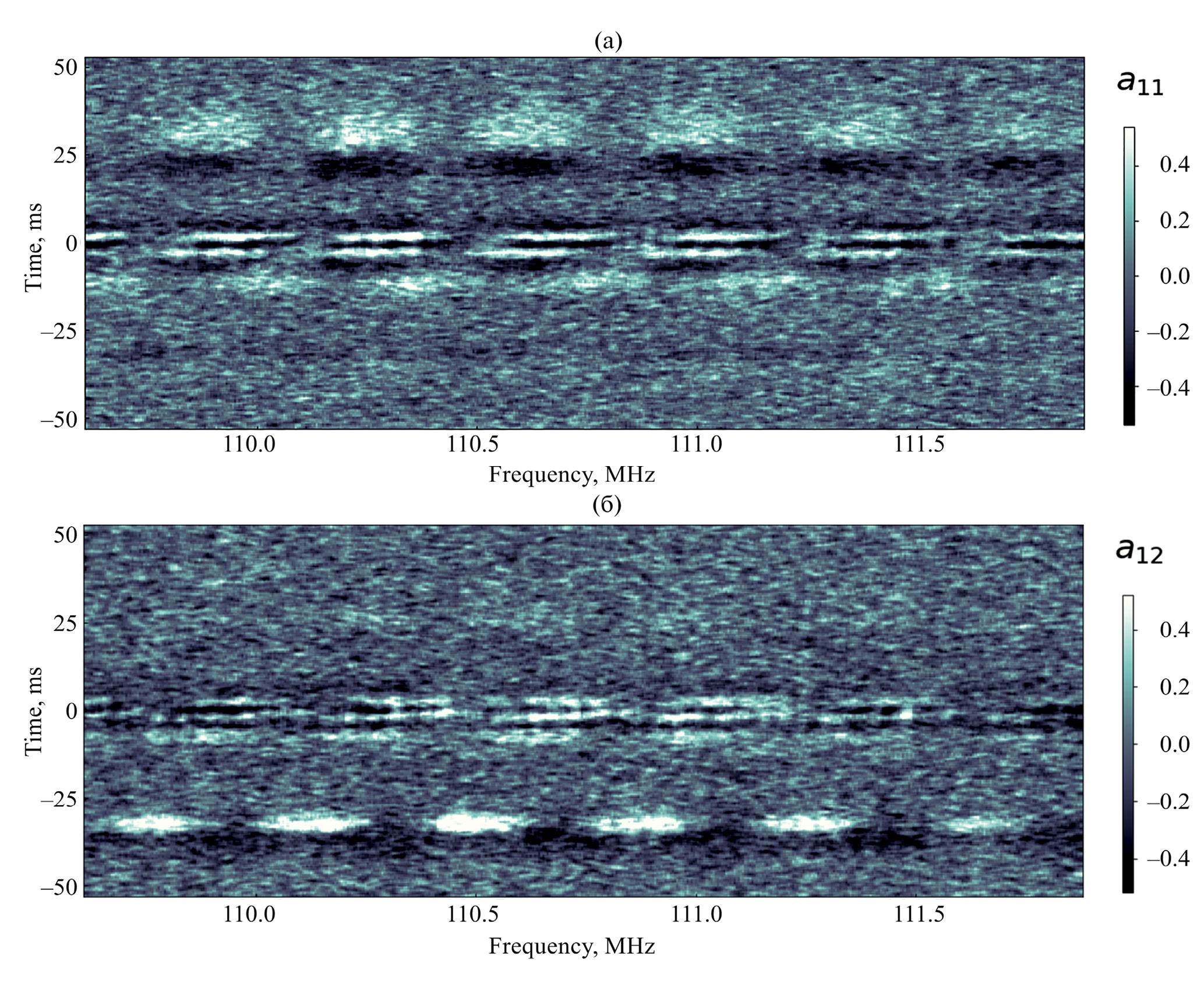 Рис. 6. Одиннадцатая (a) а₁₁ и двенадцатая (в) а₁₂ ЧВЭОФ в разложении динамического спектра PSR B0329+54, подтверждающие асимметрию временного профиля либо джиттер импульсной последовательности наряду со слабой взаимной корреляцией наиболее “удаленных” составляющих импульса — V-й и I-й (отвечающих временам около 26 мс и –33 мс соответственно), обе с похожими признаками модуляции фарадеевского типа.