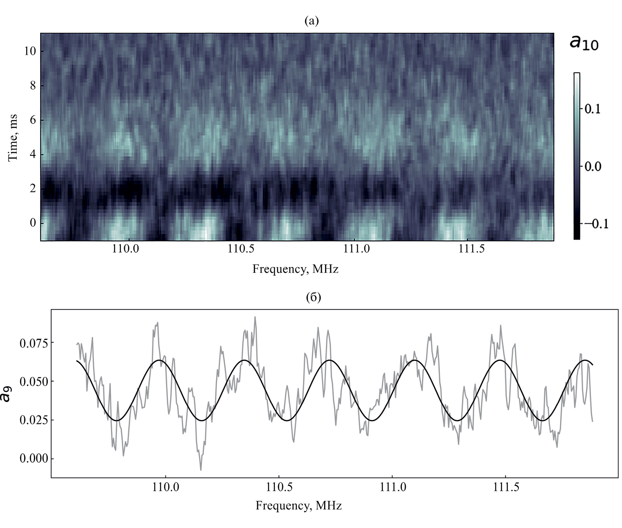 Рис. 7. Десятая a10 ЧВЭОФ в разложении динамического спектра PSR B0329+54: (a) — частотно-временная форма в области IX-й составющей импульса, сосредоточенной на временах t около 5 мс (ниже ряд темных пятен отвечает IV-й составляющей при t ≈ 2.5 мс); (б) — аппроксимация “фарадеевской” модуляции (усл. ед.) для одного из кадров динамического спектра с хорошо выраженной IX-й составляющей на уровне tIX = 5 мс гармоническим колебанием с частотным периодом tIX = 0.38 МГц, равным ширине почти 78 спектральных каналов приемника, каждый с полосой 4.88 кГц.