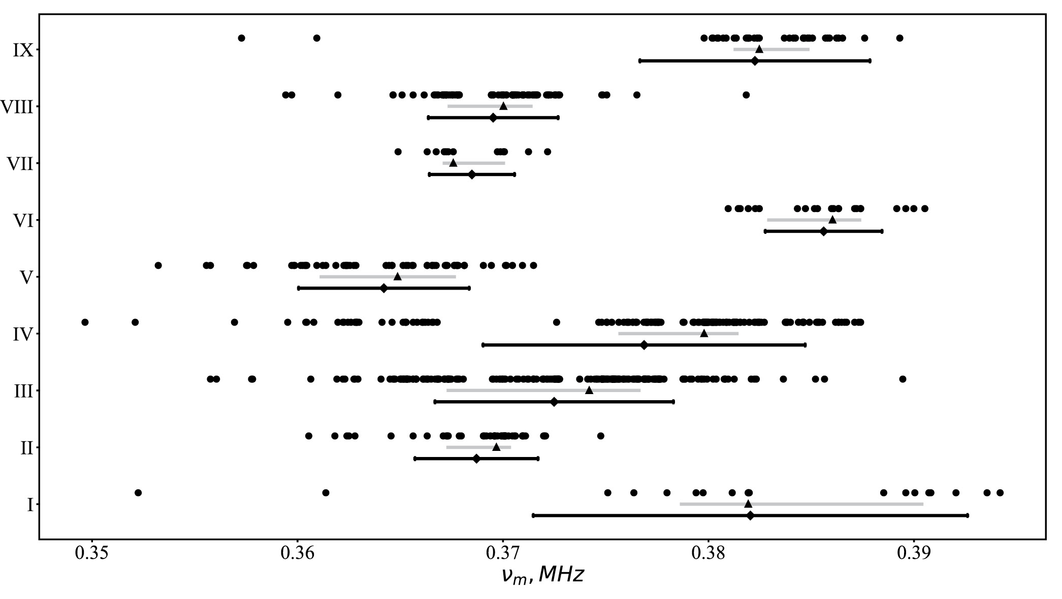 Рис. 8. Распределение частотного периода “фарадеевской” модуляции vₘ для девяти составляющих импульса (номер m дан по оси ординат). Каждая точка — результат измерения периода для одного кадра трех серий наблюдений, содержащих около 1350 кадров, из которых выбраны имеющие максимум динамического спектра для данной составляющей при t = tₘ, заметно превышающий уровень шумов. Треугольник и проходящая через него тонкая линия отвечают положению медианы и квартилю от 25% до 75%; ромб и толстая линия — среднему значению и стандартному отклонению соответственно.