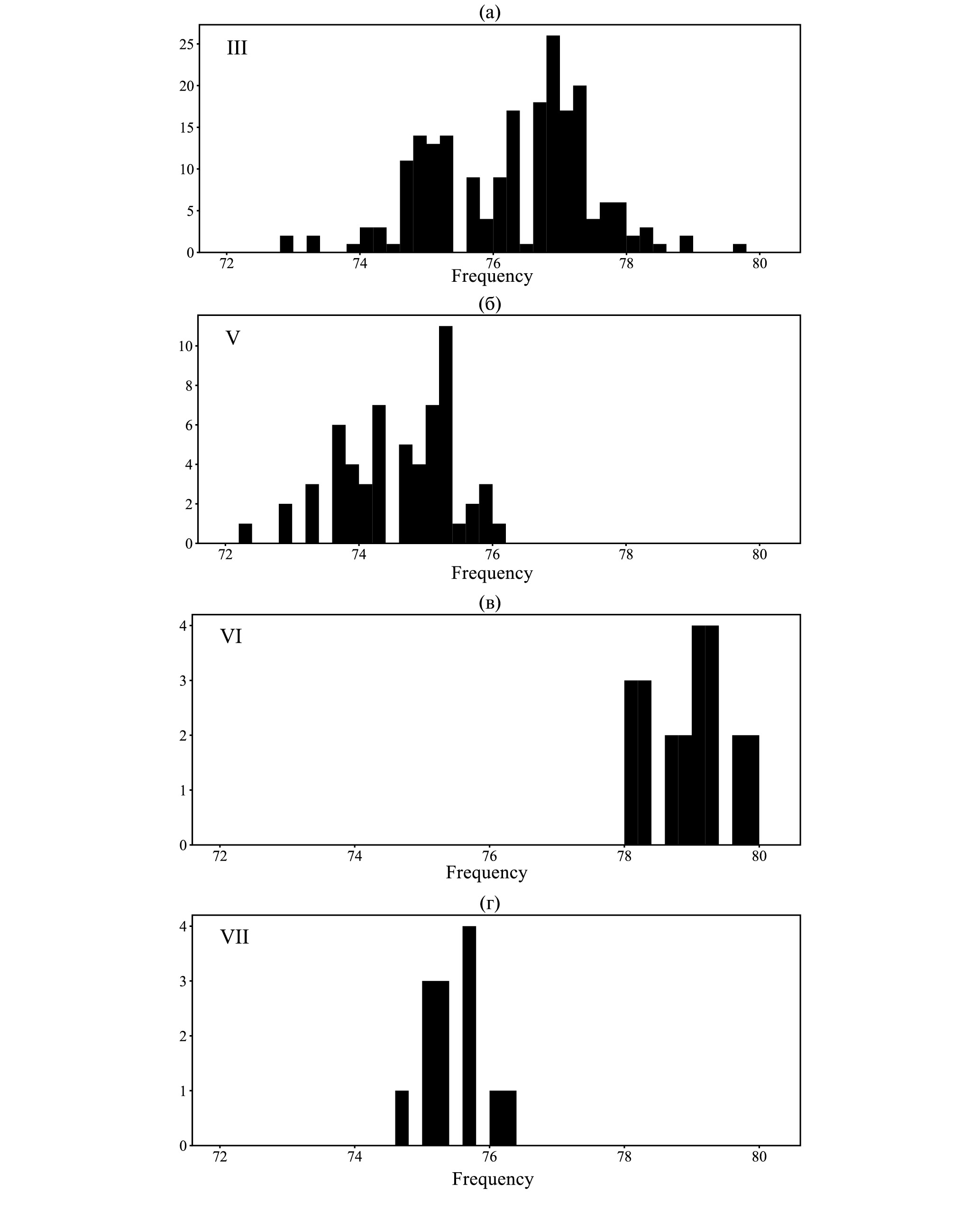 Самое низкое значение периода “фарадеевской” модуляции ⟨vV⟩ ≈ 0.365 МГц, примерно равное ширине 75 спектральных каналов приемника, имеет V-я составляющая, далеко отстоящая от основной III-й. Почти такие же низкие значения среднего периода около 0.37 МГц имеют и составляющие II, VII, VIII, близкие друг к другу. Следует обратить внимание на то обстоятельство, что для всех указанных четырех составляющих стандартное отклонение проведенных измерений, как ясно из рис. 8, существенно меньше отличия их периода “фарадеевской” модуляции от такого, значительно бóльшего периода у составляющих VI и IX, для которых стандартное отклонение измерений тоже невелико. Обнаруженные отличия рассчитанных эффективных периодов в 3–6% должны учитываться при построении модели источника излучения PSR B0329+54. Желательно, конечно, и повышение точности подобных измерений путем использования большего массива наблюдательных данных. Представленные результаты проиллюстрированы гистограммами соответствующих измерений частотного периода “фарадеевской” модуляции для составляющих III, V, VI, VII на рис. 9, где по вертикальной оси легко проследить количество использованных кадров наблюдений с учетом конечного шага гистограмм по частоте, равного десятой части ширины полосы частотного канала приемника, т.е. 488 Гц.