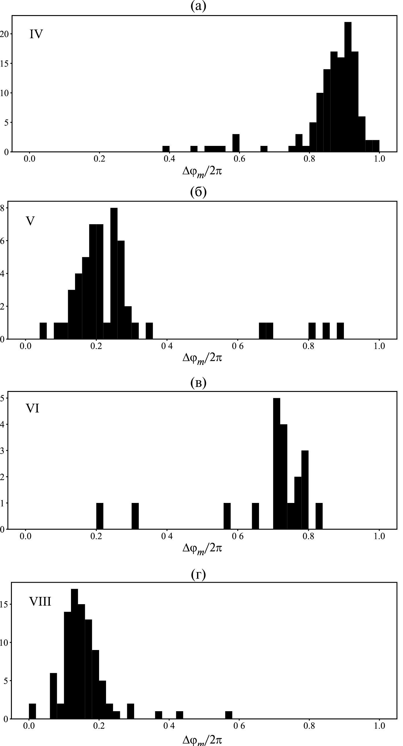 Рис. 10. Гистограммы относительной фазы “фарадеевской” модуляции для четырех составляющих импульса m (указаны в углу графиков (a)–(г)), ∆ϕm = ϕIII - ϕm, рассчитанной вычитанием из фазы фарадеевского вращения третьей составляющей III и приведением к интервалу [0,2π ] путем добавления надлежащего числа величин ±2π.
