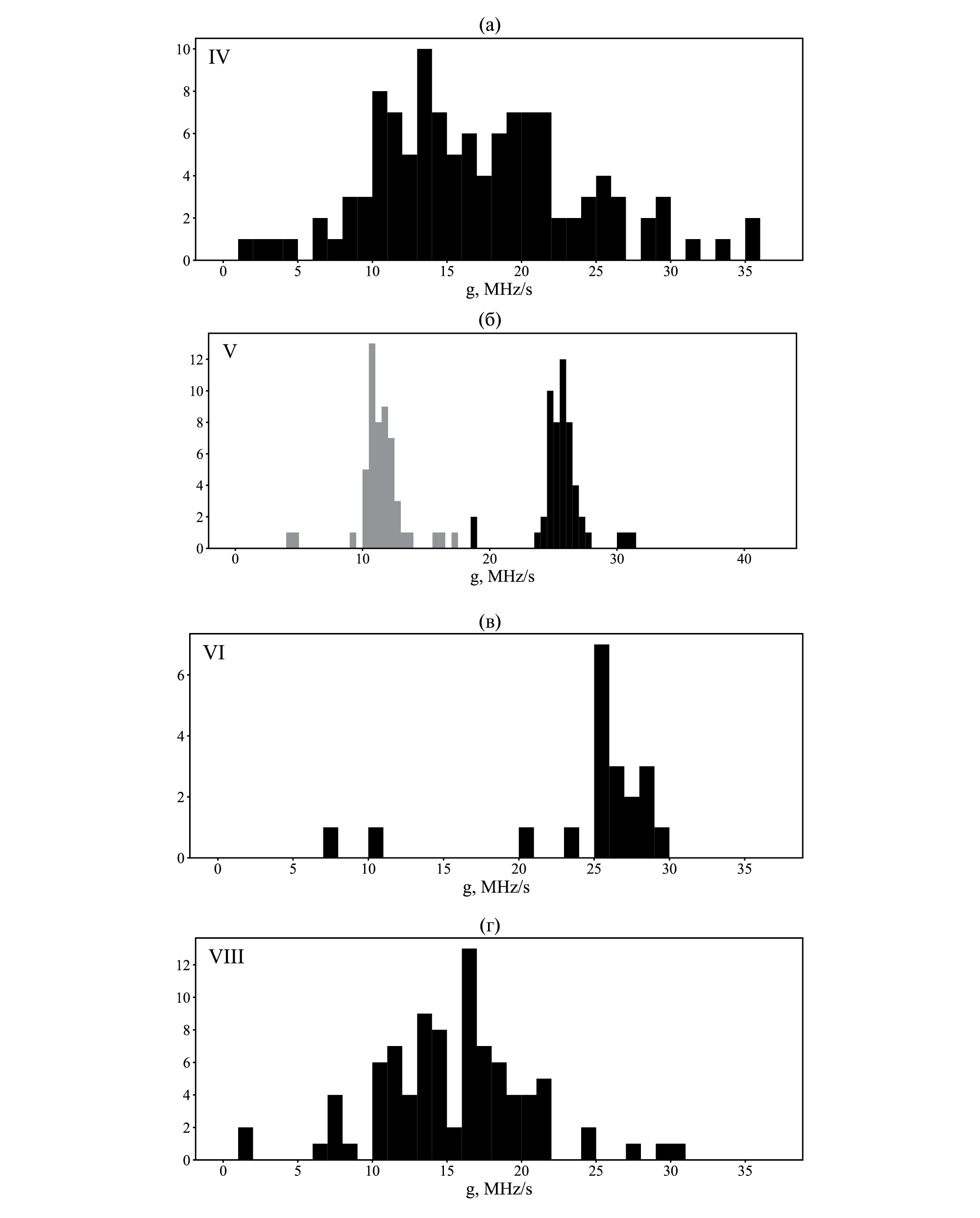 Рис. 11. Гистограммы частотного чирпа “фарадеевской” модуляции для четырех составляющих импульса m (указаны в углу графиков (a)–(г)), рассчитанного по формуле g = ∆ϕmνm / (2π | tm |) и примерно равного локаль- ной скорости смещения максимума или минимума сигнала на плоскости частота–время (ν,t). На гистограмме (б) серым и черным оттенками показаны два возможных распределения чирпа, в расчете которых для каждого кадра использованы два физически оправданных значения разности фаз – ∆ϕV, отличающихся на 2 π.