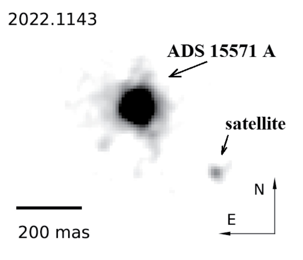 Для подтверждения существования спутника в 2014 г. были проведены спекл-интерферометрические наблюдения звезды ADS 15571 A на телескопе БТА — изображение спутника было получено. Угловое расстояние между компонентом A и спутником составило 0".14, разность звездных величин — 3.5m. Эти наблюдения были продолжены по февраль 2022 г., в результате было получено 28 положений спутника относительно главного компонента (см. табл. 1). К концу ряда угловое расстояние выросло до 0".30. Дуга наблюдений охватывает около половины видимой орбиты спутника, что позволяет произвести определение его истинной орбиты различными способами.