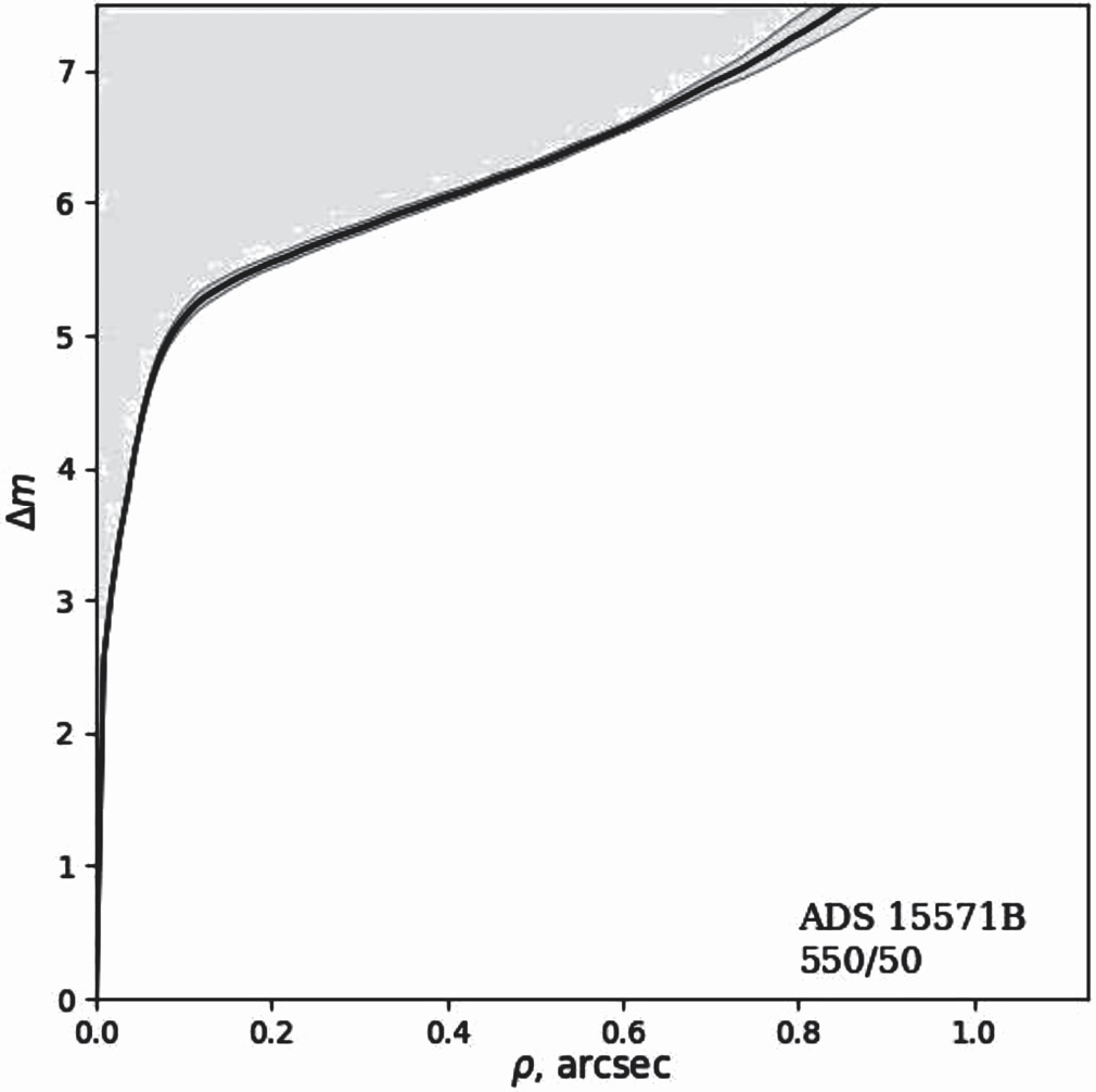 В течение некоторого времени также проводилась проверка возможности обнаружения спутника у второй яркой звезды системы — ADS 15571 B. На основе всех полученных измерений было надежно установлено отсутствие признаков наличия спутников звездных масс в окрестности данной звезды при разности блеска ниже и на расстояниях выше значений, представленных на рис. 2.