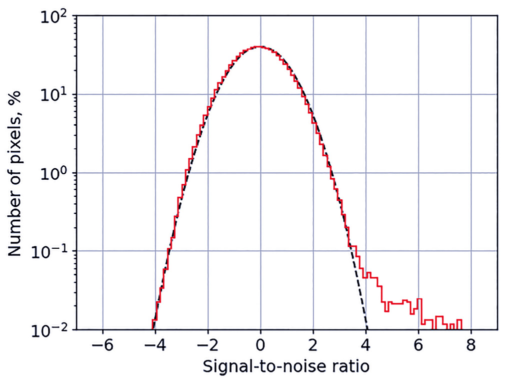 Рис. 1. Распределение значений элементов изображения поля М81 (рис. 2) в единицах отношения сигнал/шум (красная гистограмма). Пунктирной линией показано нормальное распределение со среднеквадратичным отклонением, равным единице.