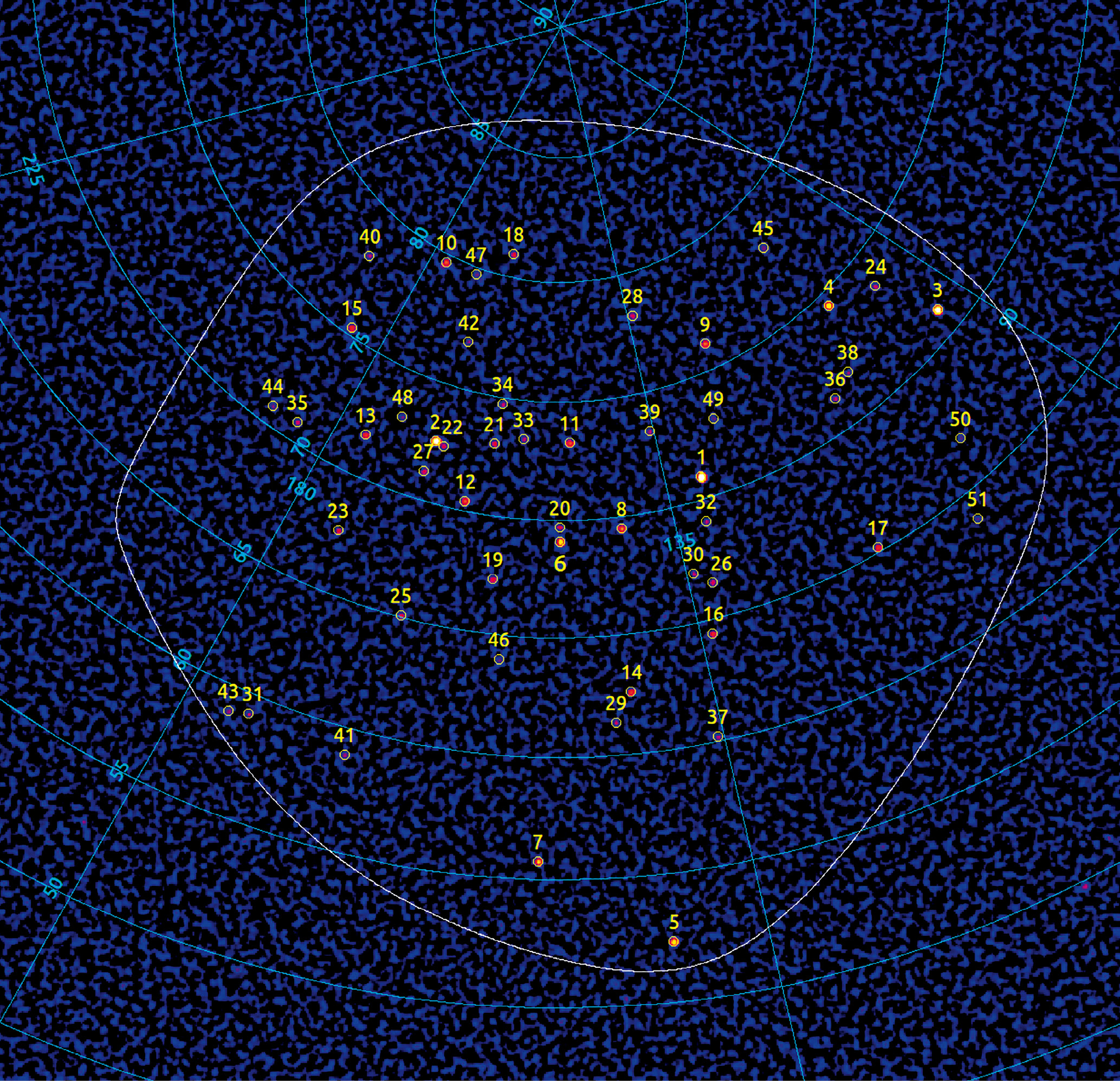Рис. 2. Карта области неба около галактики М81 (источник под номером 6) в диапазоне энергий 25–60 кэВ по данным телескопа IBIS обсерватории ИНТЕГРАЛ, накопленным за время экспозиции 19.2 Мс (с учетом мертвого времени). Номера источников, отсортированные по значимости детектирования, соответствуют номерам в табл. 1. Белый контур ограничавает область обзора, в которой чувствительность превышает 0.72 мКраб. В этой области проводилось детектирование источников. Полный размер изображения составляет 48° × 48°. Координатная сетка отображает экватариальную систему координат, в верхней части изображения виден северный полюс.