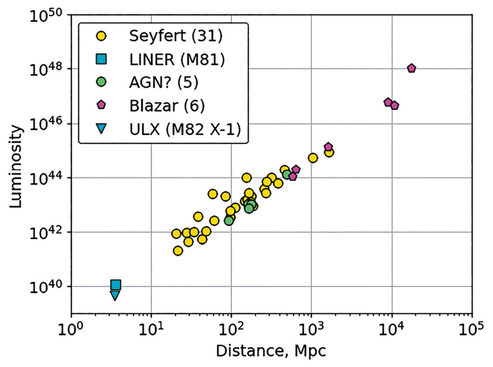 Рис. 4. Диаграмма расстояние – светимость в диапазоне 25–60 кэВ для внегалактических объектов в поле М81. Объекты разбиты на 5 категорий: 1) сейфертовские галактики (“Seyfert”, 31 объект), 2) галактики LINER (один объект М81), 3) блазары (“Blazar”, 6 объектов), 4) кандидаты в АЯГ (“AGN?”, 5 объектов с известным красным смещением), 5) ультраяркие рентгеновские источники (“ULX”, один объект M82 X-1).