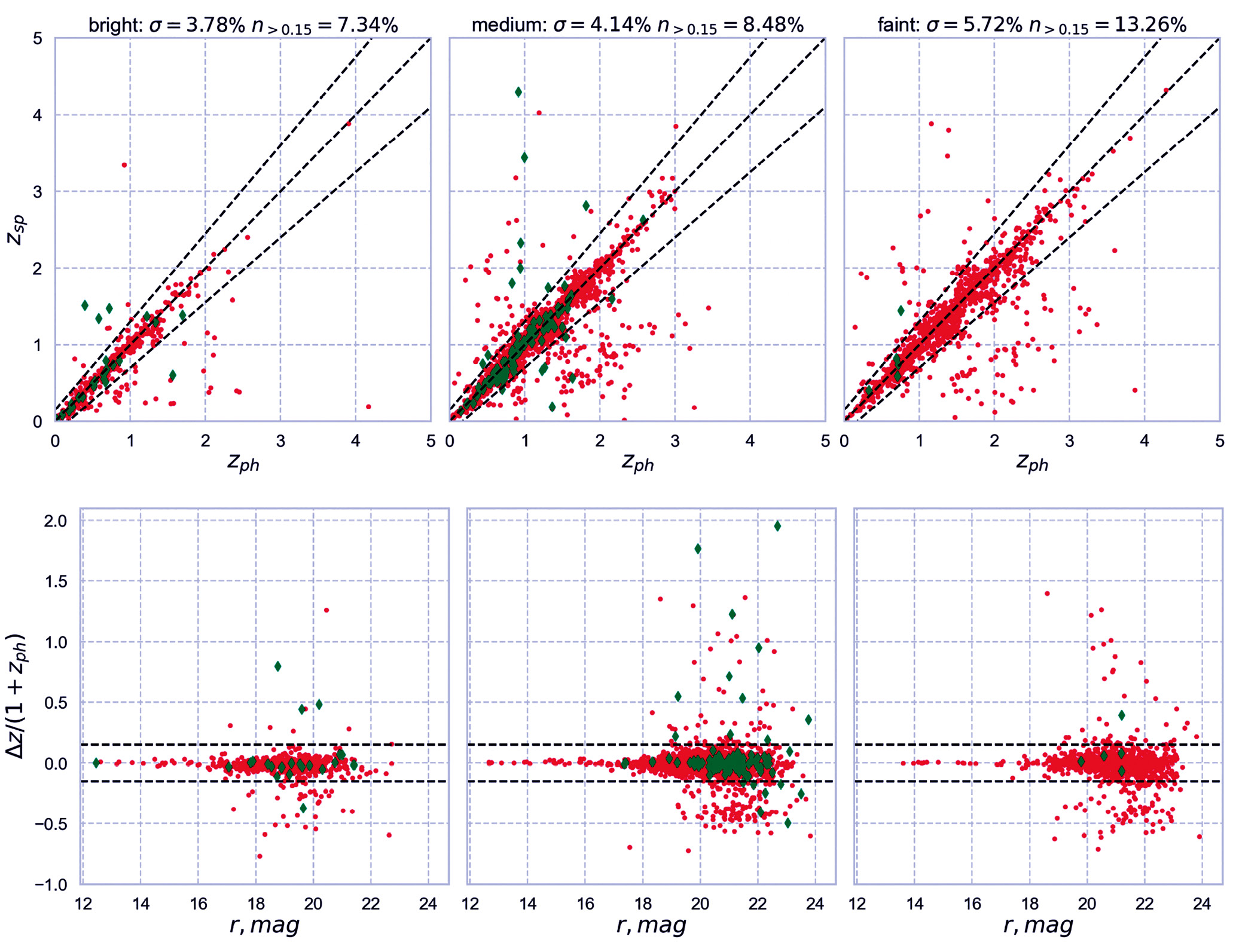 - В измерениях photo-z рентгеновских квазаров присутствуют, так называемые, катастрофические выбросы – значительные отклонения измерения photo-z от красных смещений линий в спектрах объектов. Присутствие выбросов в прогнозах вызвано неоднозначностью самого преобразования фотометрических признаков рентгеновских объектов в красные смещения (Xph → z). При этом, доля выбросов зависит от различных факторов: от набора использованных фотометрических фильтров (Мещеряков и др., 2018), от выбранного алгоритма photo-z, репрезентативности и объема тренировочных выборок (или набора шаблонов), на которых модель обучается. Модели SRGz в области покрытия обзоров DESI Legacy Imaging Surveys/Pan-STARRS1/SDSS, в настоящее время, позволяют получить прогнозы photo-z c долей выбросов на уровне n>0.15 = 7–8.5% для рентгеновских источников с FX,0.5–2 ≥ 1.5 × 10–14 эрг с–1 см–2.