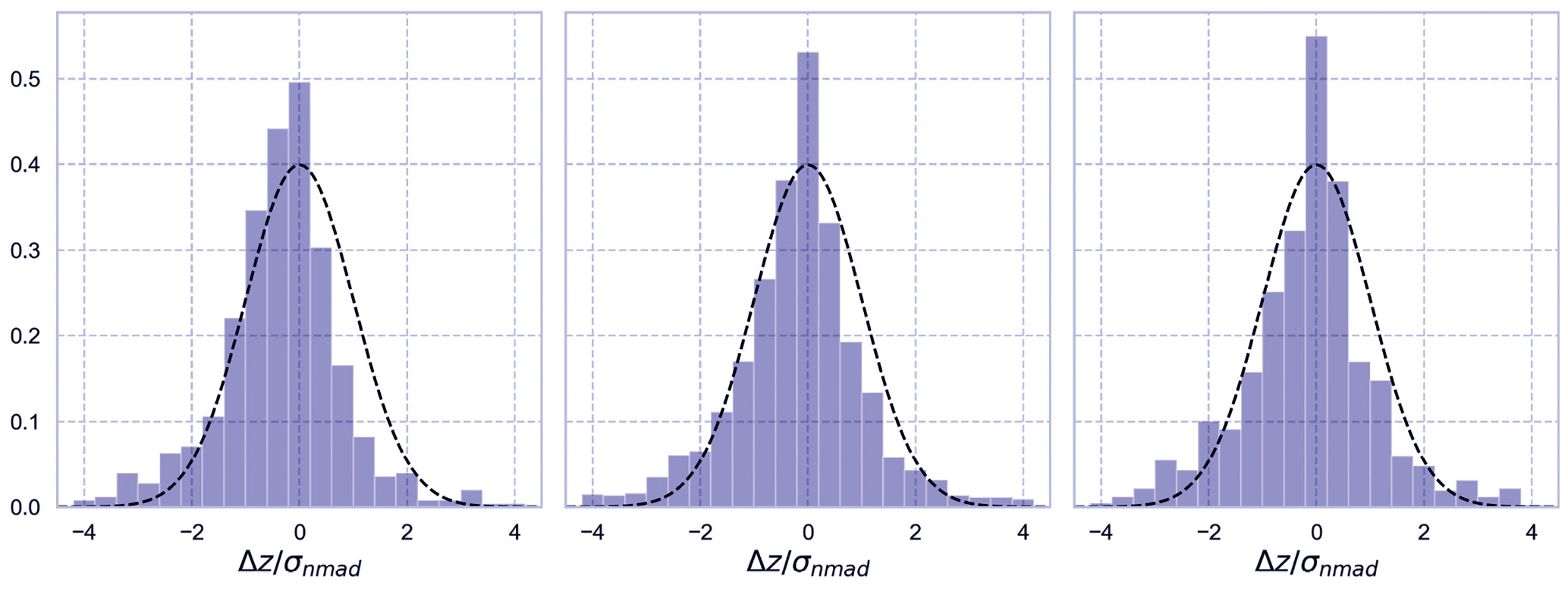 - Еще одной важной особенностью прогнозов фотометрических красных смещений рентгеновских квазаров (связанной напрямую с наличием выбросов) является их негауссовость, что не позволяет при описании ошибки прогноза photo-z ограничиться только значением его стандартного отклонения. Функция распределения вероятностного прогноза PDF(z) может иметь мультимодальный характер. Восстановление этой функции для каждого рентгеновского объекта является значительно более сложной задачей, чем получение точечного прогноза zph.