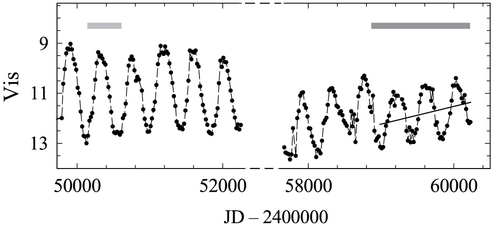 Рис. 1. Кривая блеска T Cyg в видимом диапазоне, построенная по усредненным данным AAVSO. Прямая линия отражает тренд среднего уровня блеска в период ИК-наблюдений T Dra в КГО. Полосы над кривой блеска отмечают диапазоны дат, в которые были получены спектры ISO (светло-серая полоса) и спектры КГО (темно-серая полоса).