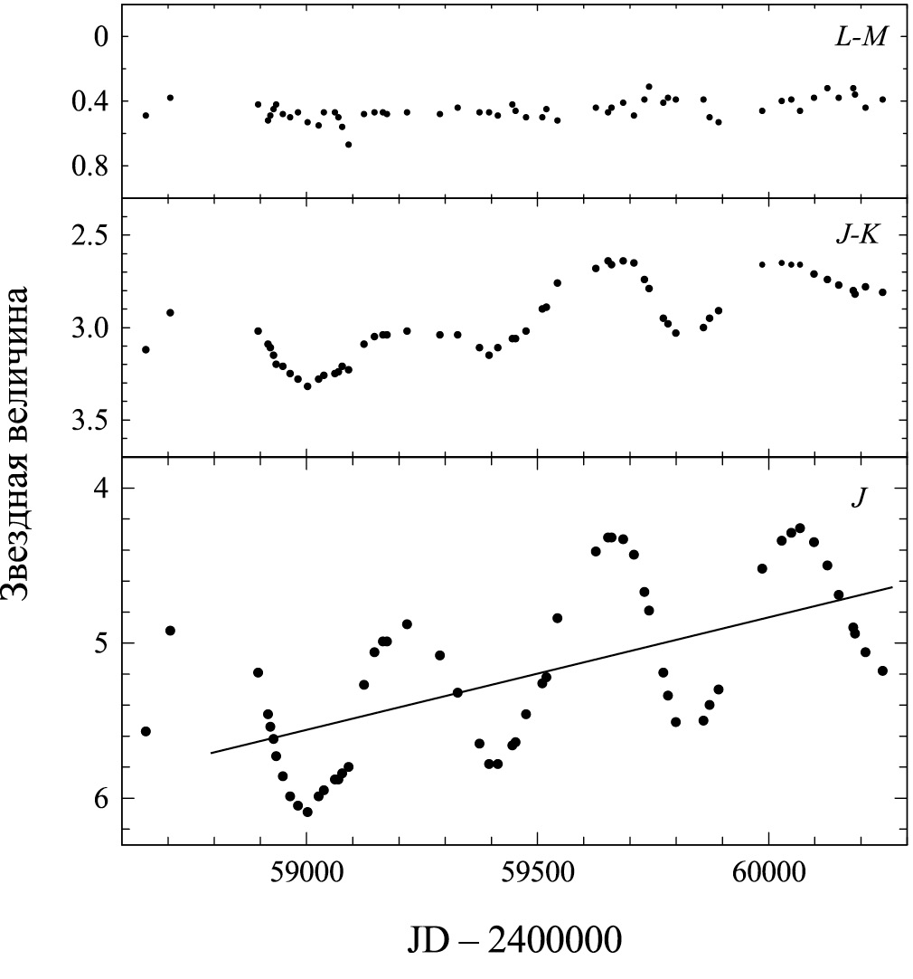 Амплитуды фазовых кривых после учета тренда среднего уровня блеска составили ∆J = 1.2m, ∆H = 1.1m, ∆K = 0.9m, ∆M = ∆L = 0.84m. Подобное падение амплитуды с ростом длины волны характерно для мирид. Оно наблюдалось, например, у углеродной мириды V CrB (Федотьева и др., 2020) и у классической мириды R Cas Вейгельт и Юдин (2001).