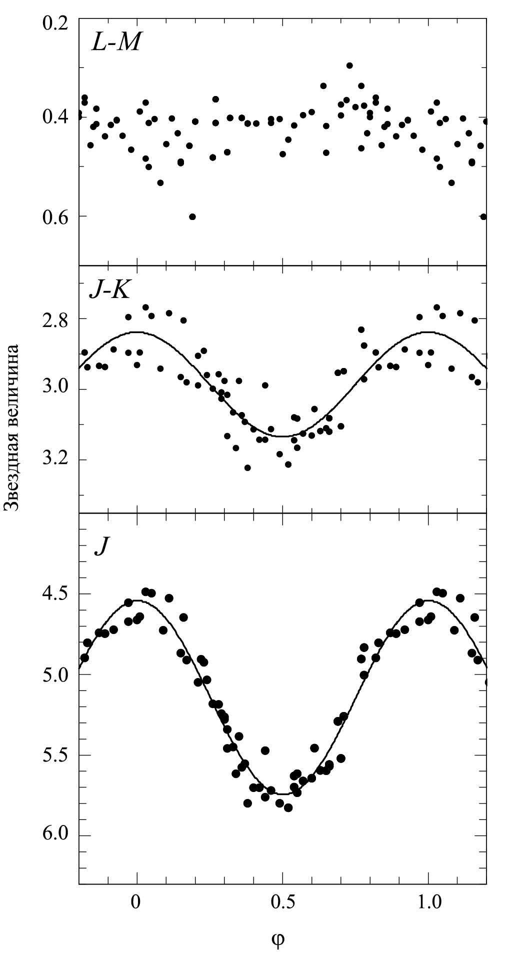 Точек на ИК-кривых блеска не достаточно для определения периода колебаний блеска. Однако можно сделать оценку момента начальной фазы. Для всех полос получились близкие эфемериды максимумов блеска: JDmax = 2459221 + 421.62E, где период взят из работы Самуся и др. (2017). Таким образом, наблюдается сдвиг примерно на 0.1P между моментами максимумов блеска в оптическом и ИК-диапазонах. На рис. 3 приведены свертки данных рис. 2 с указанными эфемеридами. Видно, что минимум ИК-блеска попадает на фазу φ = 0.5.