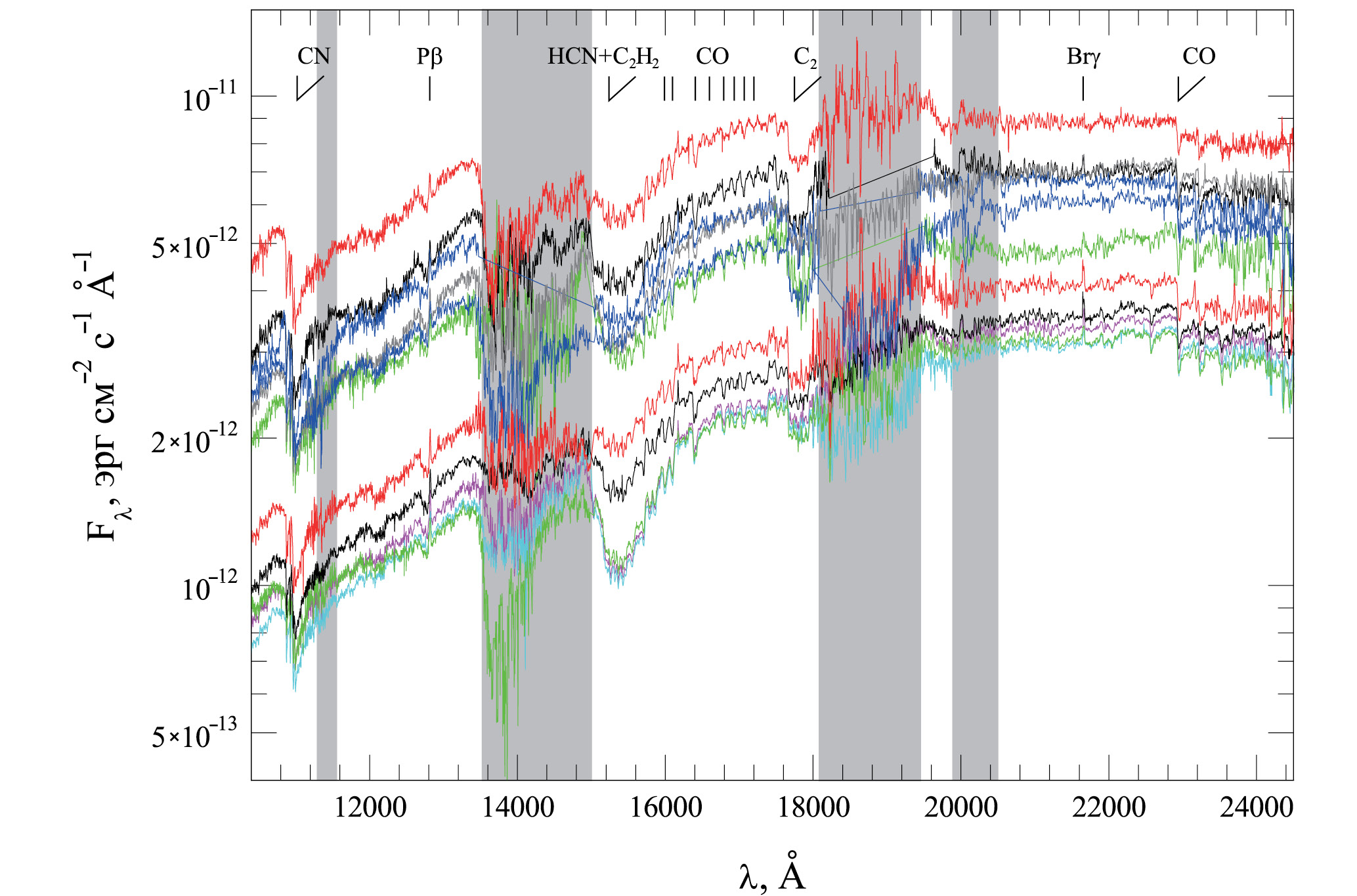 В работе Гонно и др. (2016) для сравнения разных объектов были введены спектральные индексы, вычисляемые как –2.5lg(Fcont/Fband). Индексы для перечисленных ранее молекулярных полос, измеренные по нашим спектрам, соответствуют спектральным индексам углеродных звезд с большим показателем цвета J–K, имеющим в спектре абсорбционную особенность на 1.53 мкм.