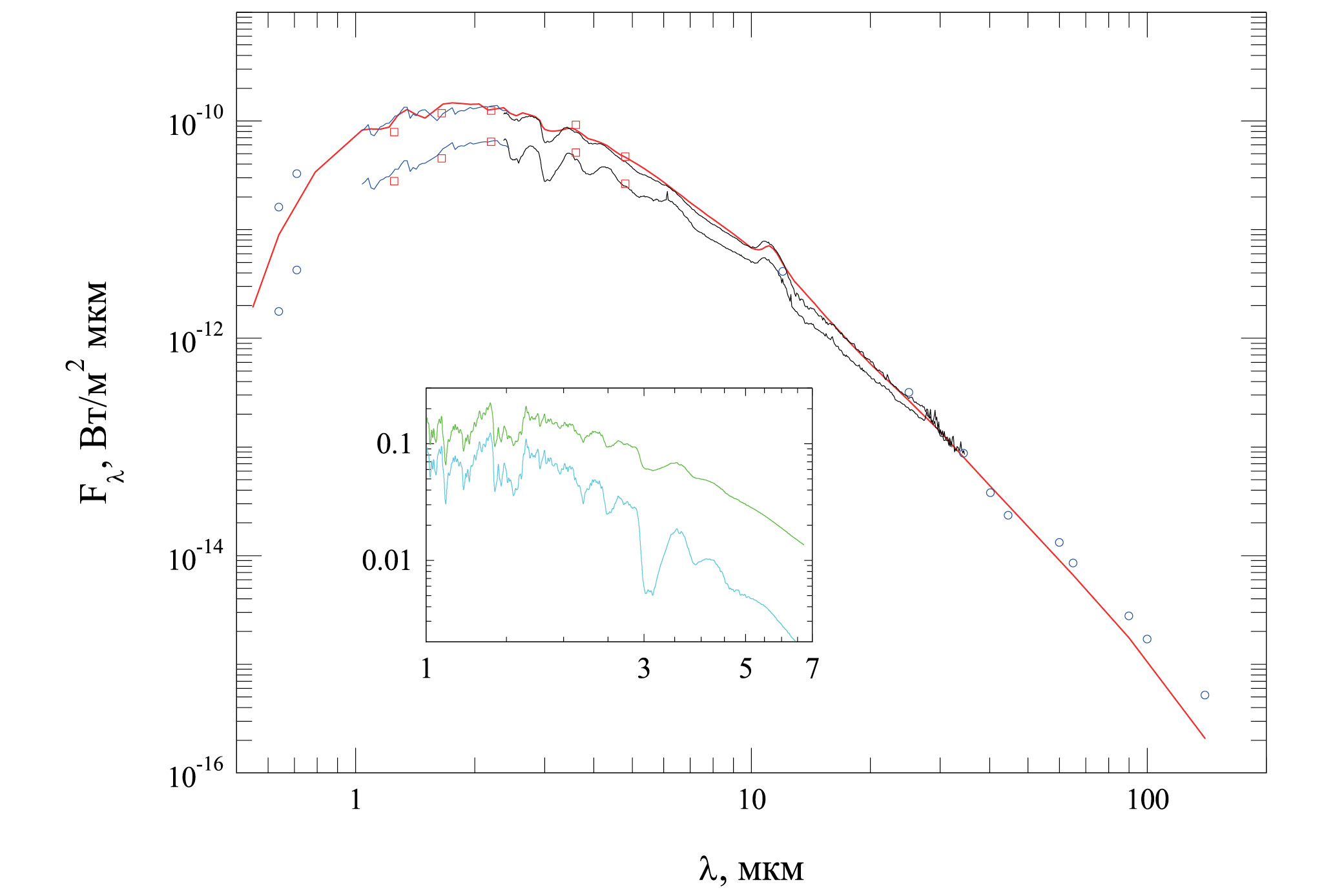 Моделирование излучения звезды, окруженной пылевой оболочкой, лучше проводить в максимально широком спектральном диапазоне. Для построения распределения энергии в спектре T Dra (далее SED) мы использовали следующие данные: спектры космической обсерватории ISO (Слоан и др., 2003) в диапазоне 2.38–45 мкм, фотометрические оценки потока в полосах 12, 25, 60 и 100 мкм из каталога спутников IRAS (Нейгебауэр и др., 1984), AKARI (Ишихара и др., 2010), WISE (Врайт и др., 2010), MSX (Еган и др., 2003) и базы данных наблюдений переменных звезд AAVSO (Клоппенборг, 2023). Кроме того, мы использовали собственные наблюдения T Dra, полученные в КГО и КАС. Все собранные данные были скорректированны за межзвездное поглощение в соответствии с законом из работы Карделли и др. (1989) для величины E(g – r) = 0.04m.