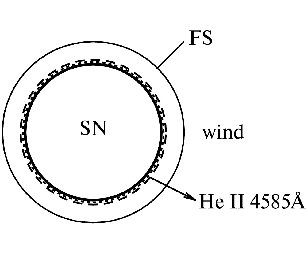 В предлагаемой картине эмиссия He II 4686 Å формируется в узком слое непосредственно перед фотосферой, которая совпадает с пограничной плотной оболочкой сверхновой (рис. 1). Слой, светящийся в линии, представлет собой двухфазную среду, в которой относительно холодные плотные фрагменты с температурой K погружены в горячий газ с температурой K. Фрагменты предположительно образовались в результате развития неустойчивости Рэлея–Тейлора (РT) при торможении самых внешних слоев оболочки сверхновой в околозвездном газе.