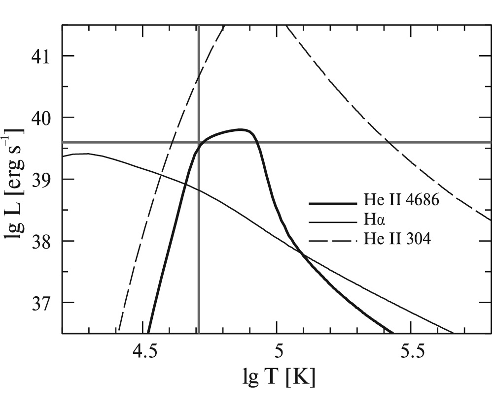 Ключевой результат моделирования – определение оптимальной температуры K, при которой воспроизводится три основных свойства линии He II 4686 Å, а именно, ее светимость, высокое отношение (фактор 5) к светимости H и значительная оптическая толщина . При этом минимизируется потеря энергии эмиссией 304 Å, светимость которой в этом случае составляет эрг с–1.