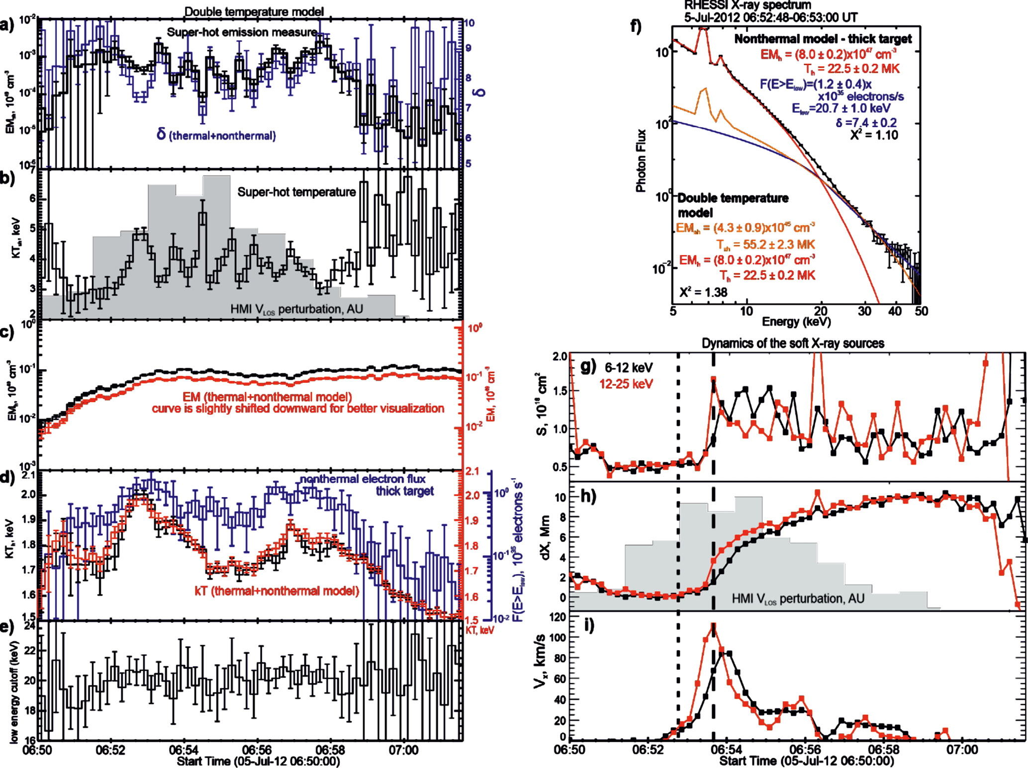 Рис. 3. Результаты аппроксимации временной последовательности рентгеновских спектров (a)–(e) в двух приближениях: 1) двухтемпературное; 2) однотемпературное и модель толстой мишени. Пример спектра, аппроксимированного в двух приближениях, показан на (f). Динамика источников мягкого рентгеновского излучения показана для двух диапазонов энергий: 6–12 (черный) и 12–25 кэВ (красный): (g) площадь источников; (h) смещение источников по гелиопроекционной координате Х (с востока на запад); (i) Х-компонента скорости источников.
