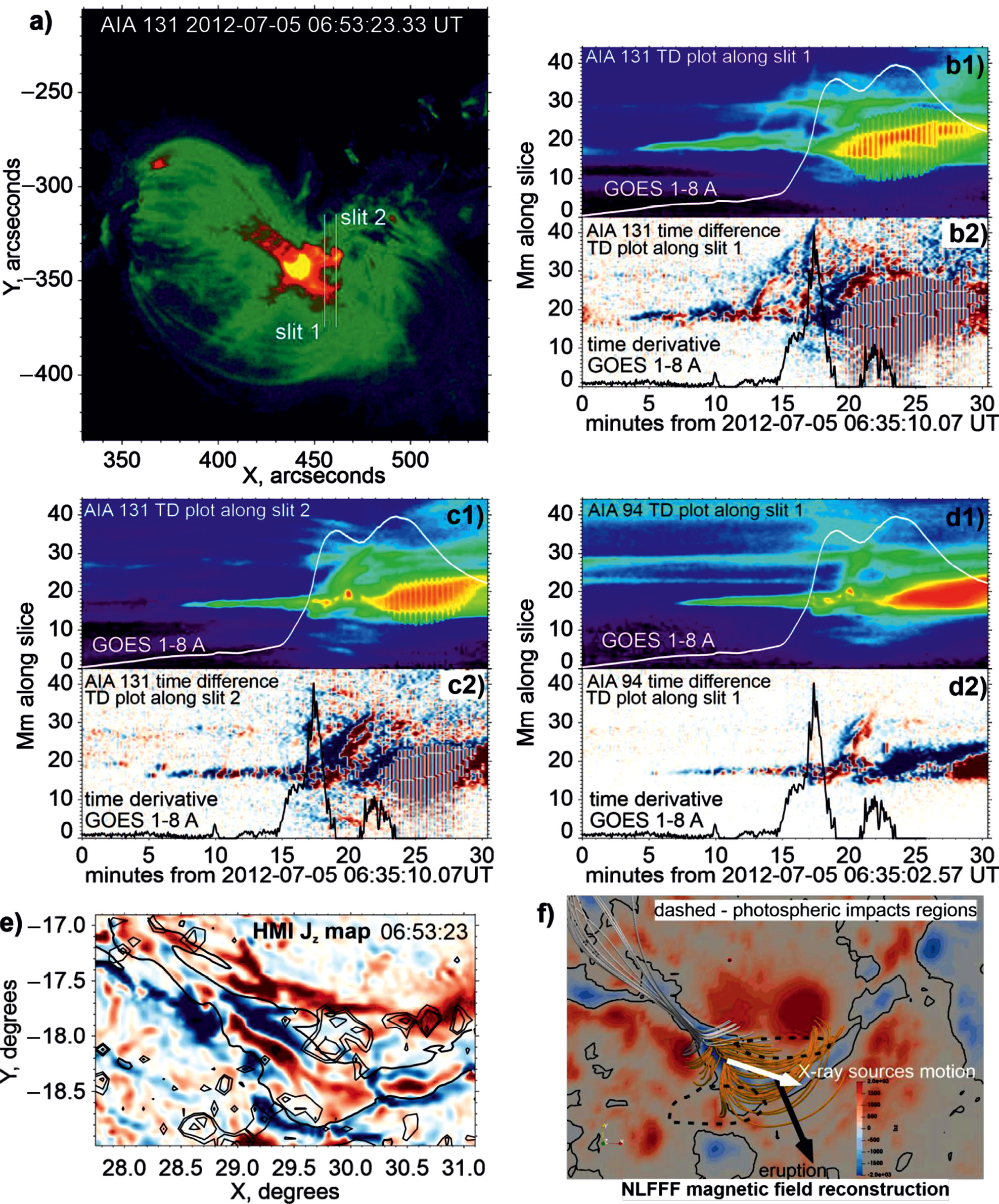 Рис. 5. На панели (а) поверх ЭУФ изображения AIA в канале 131 Å наложены два столбца пикселей (срез изображения), для которых построены диаграммы время–расстояние на панелях (b)–(d): срез 1 на (b) и (d) и срез 2 на (c). Диаграммы под цифрой 1 соответствуют временной последовательности обычных ЭУФ-изображений, а цифра 2 указывает на последовательность бегущих разностей изображений для каналов 131 (b)–(c) и 94 Å (d). На панели (е) карта вертикальных электрических токов сравнивается с областями сильных фотосферных возмущений видимых на Допплерограммах (тонкие черные контуры). Толстая черная линия показывает НЛ. Результаты нелинейной бессиловой экстраполяции магнитного поля показаны на панели (f). Фоном показаны распределения вертикальной компоненты магнитного поля и НЛ (черная линия). Области фотосферного возмущения показаны пунктиром.