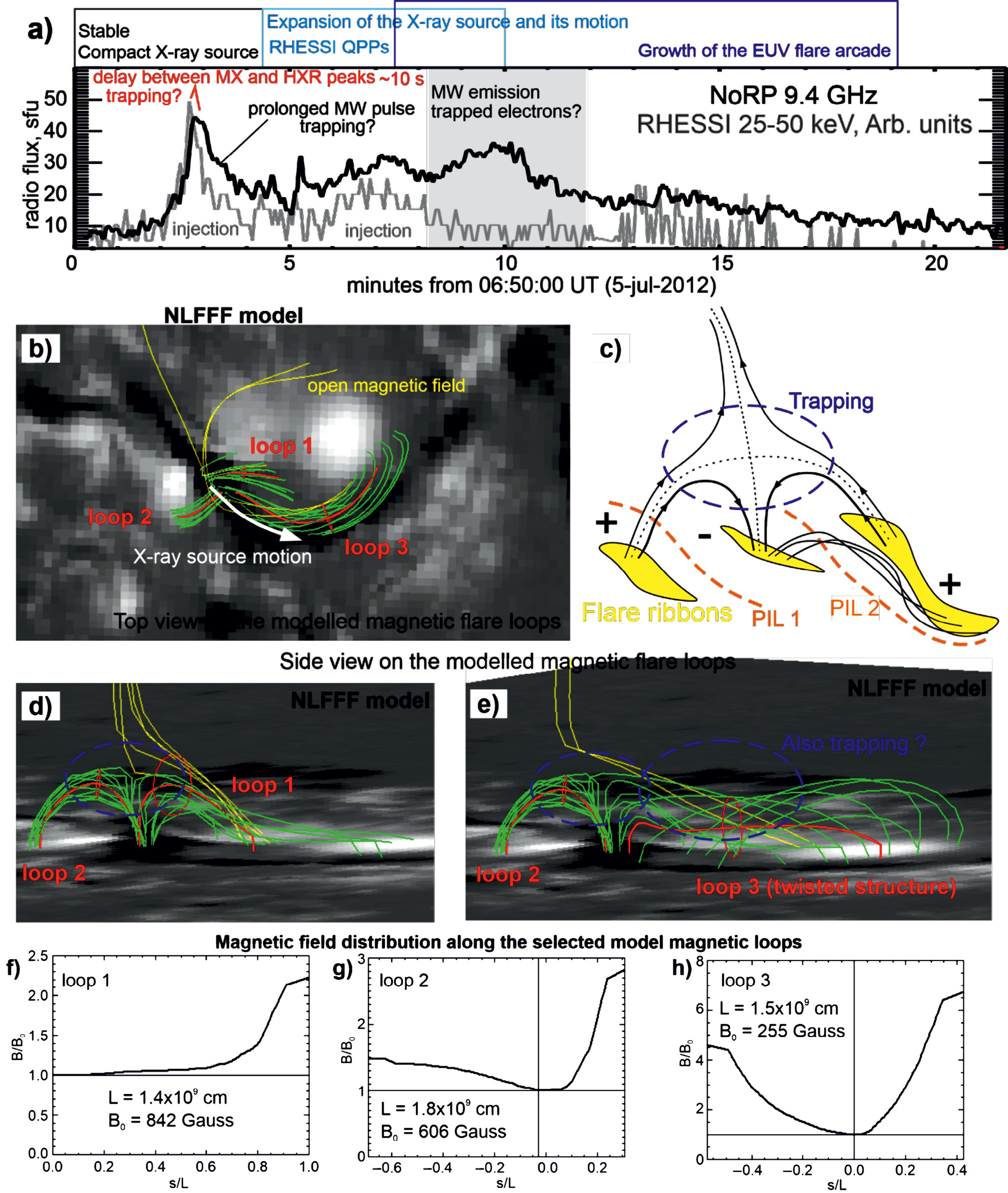 На базе NLFFF модели магнитного поля (см. предыдущий раздел), используя пакет программ GX Simulator, мы выбрали магнитные петли во вспышечной области с целью продемонстрировать наличие магнитных ловушек. Условием ловушки является наличие минимума магнитного поля в короне. Чем сильнее разница между максимумом вблизи оснований петли и минимумом в короне, тем “сильнее” ловушка. Выбрано три петли так, чтобы покрыть фазу компактного рентгеновского источника и протяженного, видимого во время пульсаций (показано схематично сверху временных профилей в прямоугольниках). Все петли показаны как сверху (рис. 6b), так и сбоку (рис. 6d,e). На панели с указана схема вспышечной области для лучшей визуализации. На трех нижних панелях показаны распределения магнитного поля вдоль выбранных структур.