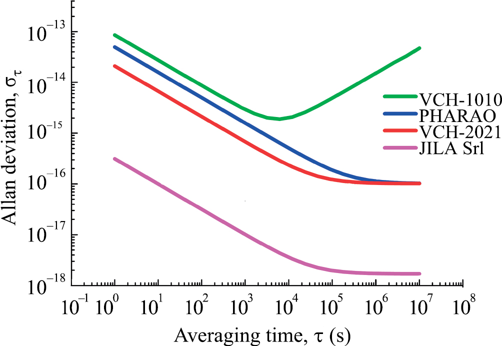 Данная модель является линейной относительно неизвестных параметров и гауссовой. Для ее полной спецификации необходимо задать сигнал , т.е. орбиты спутников, и свойства шумового процесса . Выбор орбит обсуждается в следующем разделе. Шумовой процесс удобно характеризовать с помощью его спектральной плотности мощности (СПМ). В настоящей работе мы рассматриваем четыре варианта атомных часов: бортовой водородный стандарт частоты ВЧ-1010, использованный на космическом радиотелескопе РадиоАстрон (Кардашев и др., 2013), бортовой цезиевый фонтанный стандарт PHARAO планируемого эксперимента ACES (Хесс и др., 2011), промышленный водородный стандарт частоты ВЧ-2021 (Поляков и др., 2021) и лабораторные стронциевые часы JILA SrI (Ботвелл и др., 2019). В табл. 1 приведены СПМ данных часов. Для ВЧ-1010, PHARAO и JILA SrI они были нами взяты из работы Литвинов и Пилипенко (2021), а для ВЧ-2021 восстановлены по аллановской девиации, приведенной в работе Поляков и др. (2021). На рис. 1 приведены кривые аллановской девиации частоты, соответствующие данным СПМ. Атомный стандарт ВЧ-1010 обладает стабильностью, которая ухудшается после достижения минимума на интервале усреднения ~1 ч. Стандарты PHARAO и ВЧ-2021 обладают почти одинаковой стабильностью на длительных интервалах усреднения с. Однако на малых и средних временах ВЧ2021 обладает лучшей стабильностью, чем PHARAO. Оптический стандарт JILA SrI обладает наилучшей стабильностью на всех интервалах усреднения.