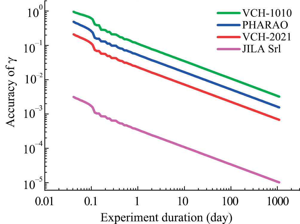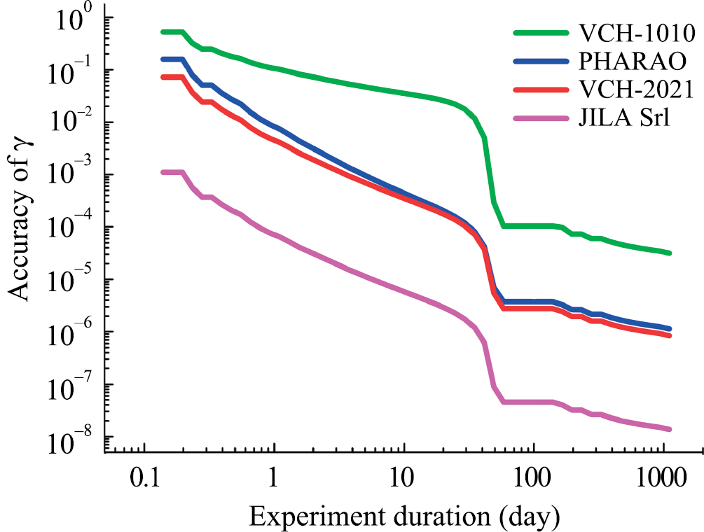 Результаты оценки точности измерения ППН-параметра для околоземного и околосолнечного экспериментов приведены, соответственно, на рис. 4 и 5 в зависимости от времени накопления. Наихудшая точность оценки в обоих случаях достигается со стандартом VCH-1010, наилучшая – с JILA SrI. Точность околоземного эксперимента с JILA SrI по результатам 3 лет накопления данных составляет . С теми же часами на околосолнечных орбитах – . Для сравнения, наилучший на сегодня результат, полученный с помощью межпланетного космического аппарата Cassini, составляет (Бертотти и др., 2003). Интересно отметить существенно разное поведение стандартов VCH-2021 и PHARAO в околоземном и околосолнечном экспериментах. В силу худшей стабильности PHARAO на малых и средних временах (рис. 1) точность околоземного эксперимента с ним оказывается в 2 раза хуже, чем с VCH-2021: против . В околосолнечном же эксперименте, где существенное изменение сигнала происходит на интервалах порядка дней, стандарты PHARAO и VCH-2021, имеющие примерно одинаковую долговременную стабильность, дают близкие результаты – и , соответственно. Полученные точности измерения не являются предельно возможными с помощью данных часов. Оптимизация параметров орбит может существенно улучшить полученные оценки.