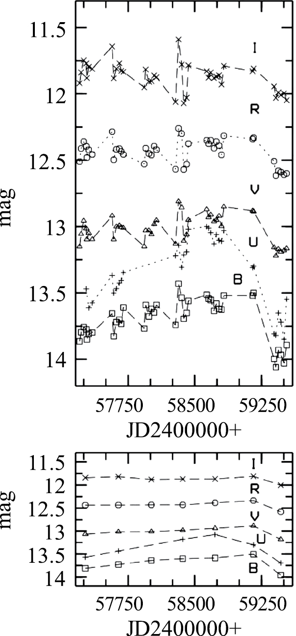 Сравнение наших наблюдательных данных на период 2016–2019 гг. в фильтрах BVRI с данными, опубликованных в работе Бинатова и др. (2023), показало совпадение по величине звездных величин (одинаковый размер апертуры 13''.5) в среднем по периоду, но практически нет совпадения по наблюдательным ночам. Объединение данных позволит увеличить плотность наблюдаемых рядов.