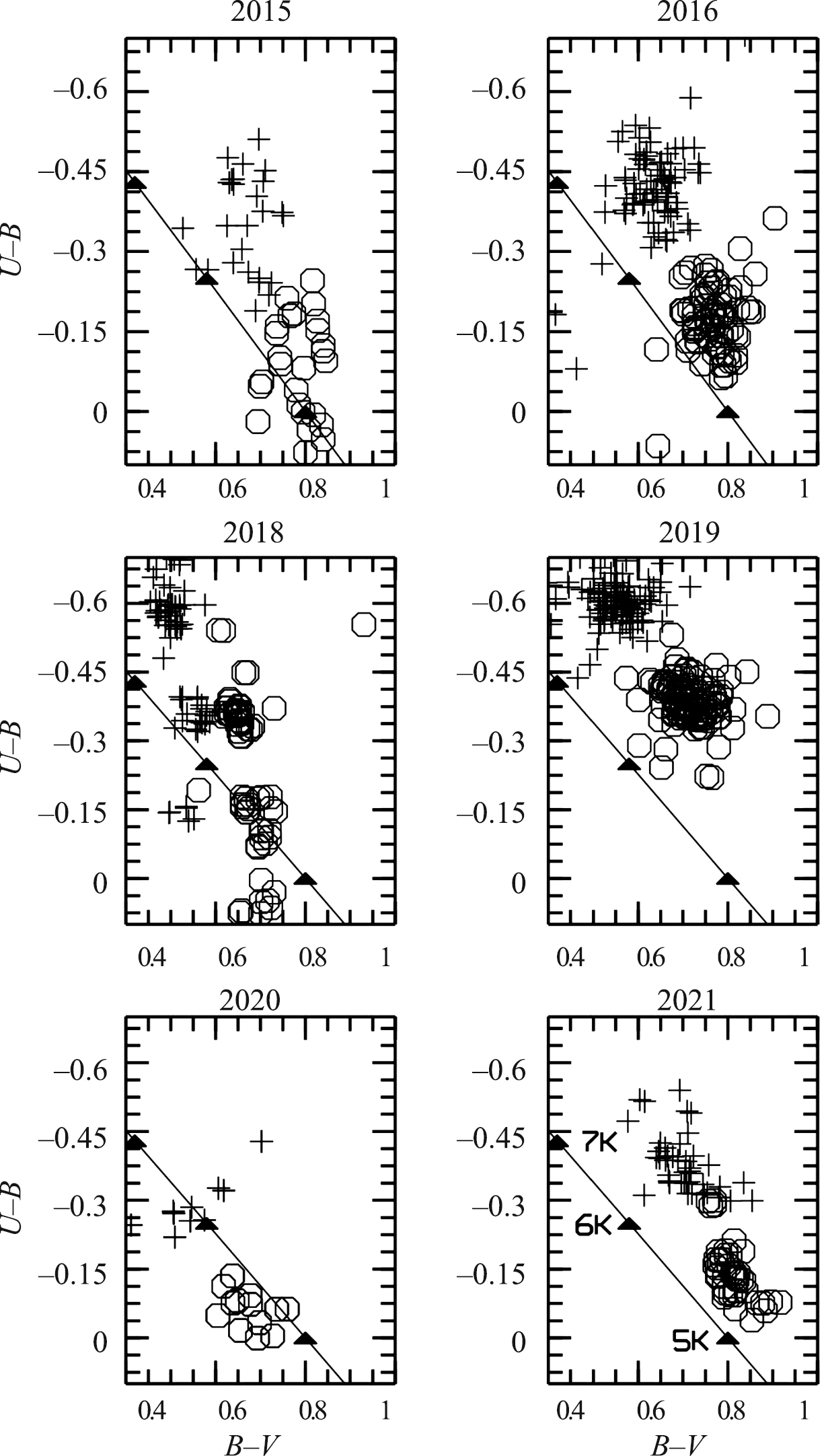 5. Fig. 4. Two-color diagrams (U–B) – (B–V). The diagram shows the color index data without taking into account galactic absorption. The + symbol is used for the color indices in a circular aperture of 5 arcsec, a circle for 30 arcsec.