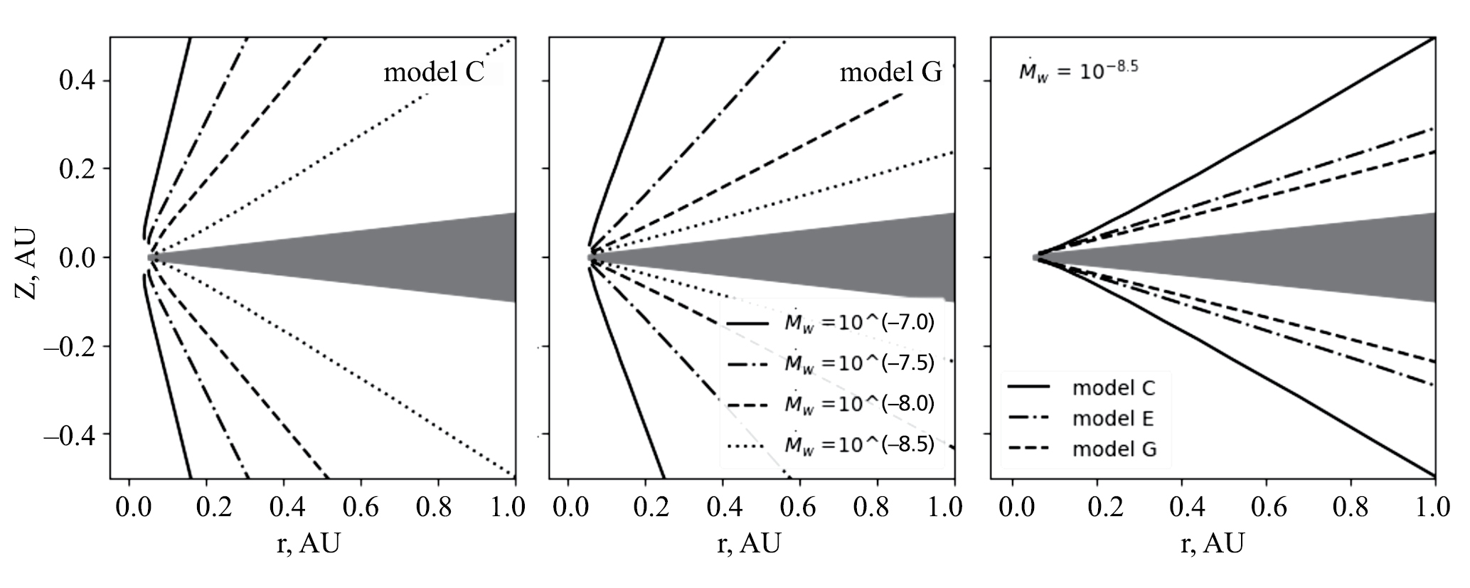 На рис. 1 представлены графики с изоденсами. Они показывают, что распределение плотности может сильно отличаться в разных моделях ветра. Модель С характеризуется крутым подъемом ветра над плоскостью диска и наибольшей плотностью вещества, а модель G – наименьшей. Модель E занимает промежуточное положение.