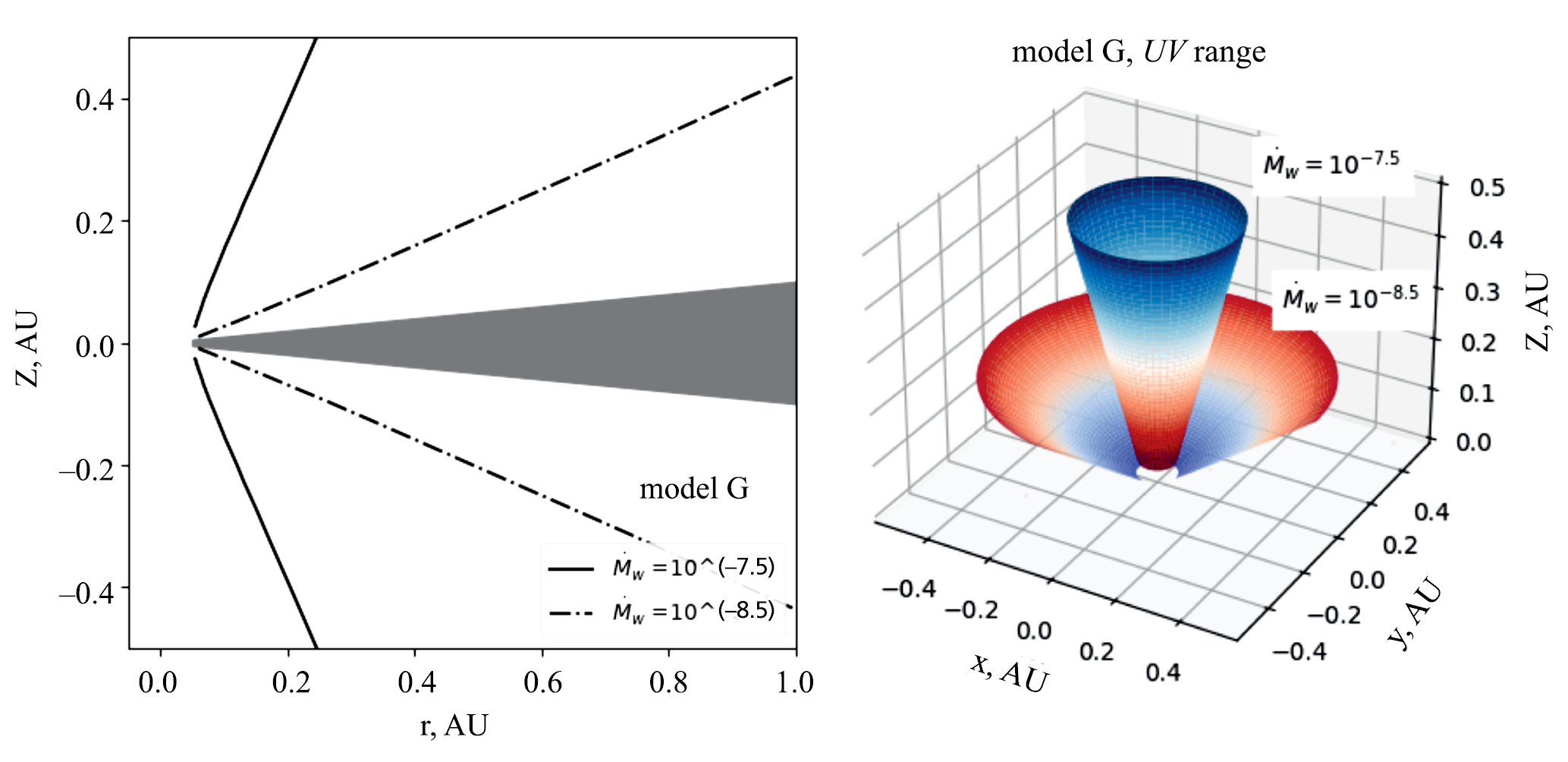 На рис. 7 слева показано сравнение сечений поверхностей для трех рассматриваемых энергий. Рисунок выполнен для модели E при темпе истечения /год, но его вид качественно отражает ситуацию во всех рассматриваемых моделях. Наибольшее поглощение достигается в мягком рентгеновском диапазоне ( кэВ). При этом поверхности для видимого (синяя линяя) и УФ (красная линяя) диапазонов всегда расположены между поверхностями, соответствующими энергиям 0.3 и 1.0 КэВ (сплошная и пунктирные линии соответственно), для всех моделей и всех значений темпа истечения. Заметим, что мягкое рентгеновское излучение аккреционных пятен, образующееся при аккреции за фронтом ударной волны (Ламзин, 1998), частично поглощается также в магнитосферах звезд типа Т Тельца в падающем на звезду потоке газа (Додин, 2018).
