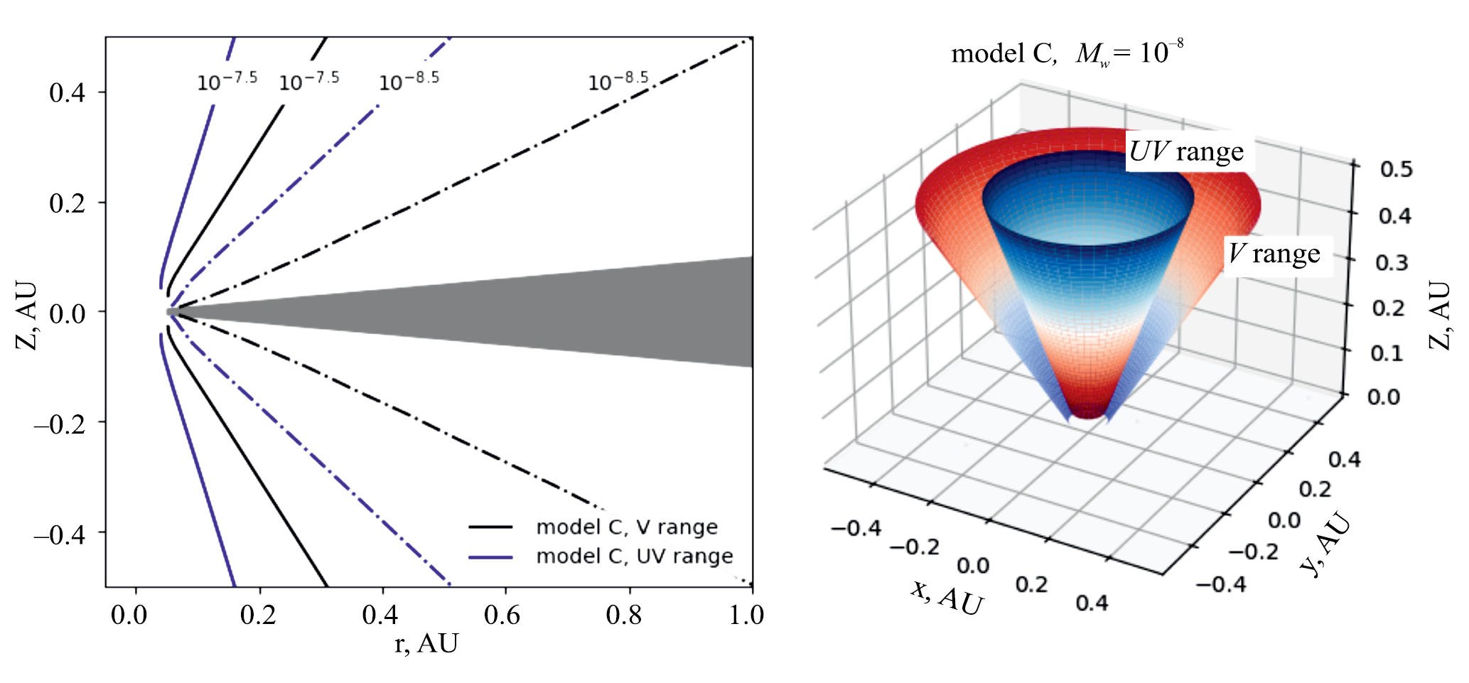 Эти предельные углы полезно знать при планировании наблюдений и их интерпретации. Они дают общее представление о характере распространения излучения центрального источника. Малые предельные углы означают, что излучение звезды испытывает сильное поглощение ветром, особенно в УФ- и мягком рентгеновском диапазонах, что в результате приводит к экранированию периферийных областей диска: они слабее освещаются звездой и, следовательно, вносят меньший вклад в интенсивность излучения системы и в фотоиспаряющийся ветер. Наибольший вклад в экранирование дает модель С с начальным углом подъема дискового ветра относительно плоскости диска 30˚. Расчеты показали, что для жесткого рентгеновского излучения с энергией 10 кэВ дисковый ветер прозрачен во всех рассмотренных моделях и при всех значениях темпа потери массы.
