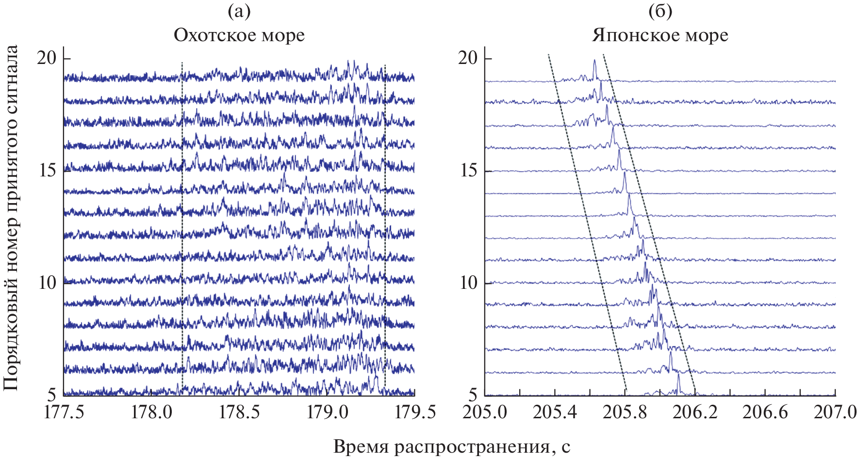 The results of studies of the features of the formation of pulse characteristics on the axis of an underwater sound channel in waveguides with different hydrological and bathymetric conditions of the Sea of Japan and the Sea of Okhotsk are discussed. The results of model calculations and experiments characterizing the regularities of propagation of low-frequency pulse signals in complex waveguides including shelf and deep sea for hundreds of kilometers are presented. It is shown that one of the main effects that determines long-range sound propagation in complex waveguides including the shelf and deep sea is the acoustic “landslide” effect. It is also shown that numerical modeling of the process of signal propagation from the shelf to the deep sea on acoustic traces in the Sea of Japan and the Sea of Okhotsk using the RAY program provides good convergence of the calculated and experimentally obtained impulse characteristics.