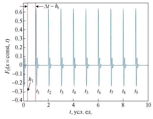 Здесь финитная функция f(x) с носителем S описывает пространственную локализацию источника, а функция g(t) определяет его временной профиль. Предполагается, что g(t) финитна и “быстро убывает” на своем носителе [0, ht], 2ht << Δt. Таким образом, во временной области источник представляет собой последовательность коротких импульсов, следующих друг за другом с интервалами Δtht (Δtht >> ht). На этих временных интервалах происходит сбор и начало обработки информации. Пример характерной зависимости F0(x, t) при фиксированном x приведен на рис. 1.