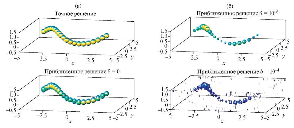 Рис. 4. (а) – Сравнение точного решения и приближенного решения для точных данных (δ = 0). (б) – Приближенные решения для возмущенных данных с δ = 10–6 и δ = 10–4.