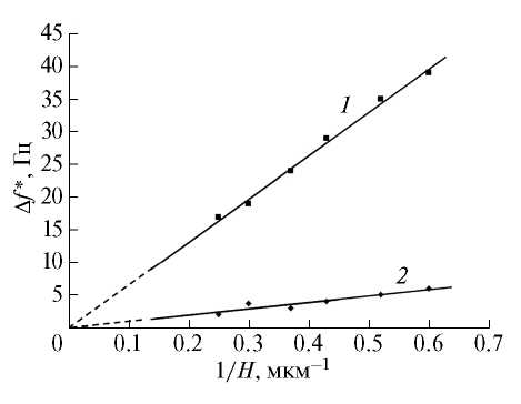 Рис. 1. Зависимости действительного (1) и мнимого (2) сдвигов резонансной частоты от обратной толщины жидкой прослойки для додекана.