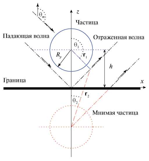здесь – скорость, наведенная падающей и отраженной от границы раздела волнами в точке, совпадающей с центром частицы, но в отсутствие самой частицы. При увеличении расстояния до границы M → 0 выражение для скорости переходит в известную формулу для свободной частицы.